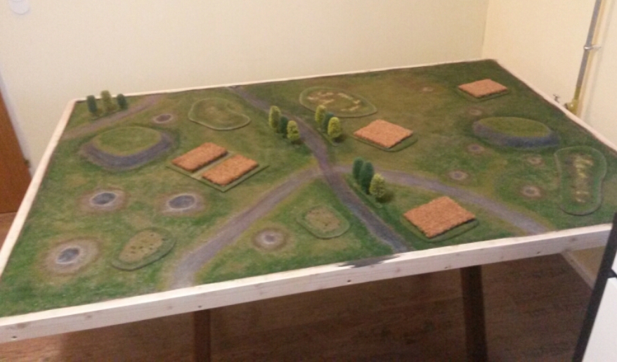 ) Mundspateln und Leim und Sand, Bases für Hecken, und mit groben Deko-Steinen Steinwälle als linear Obstacles gemacht.