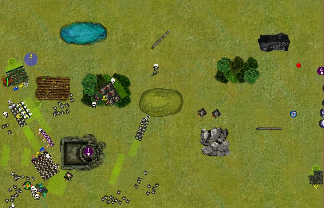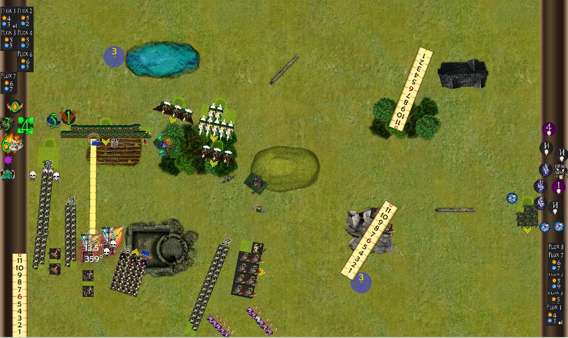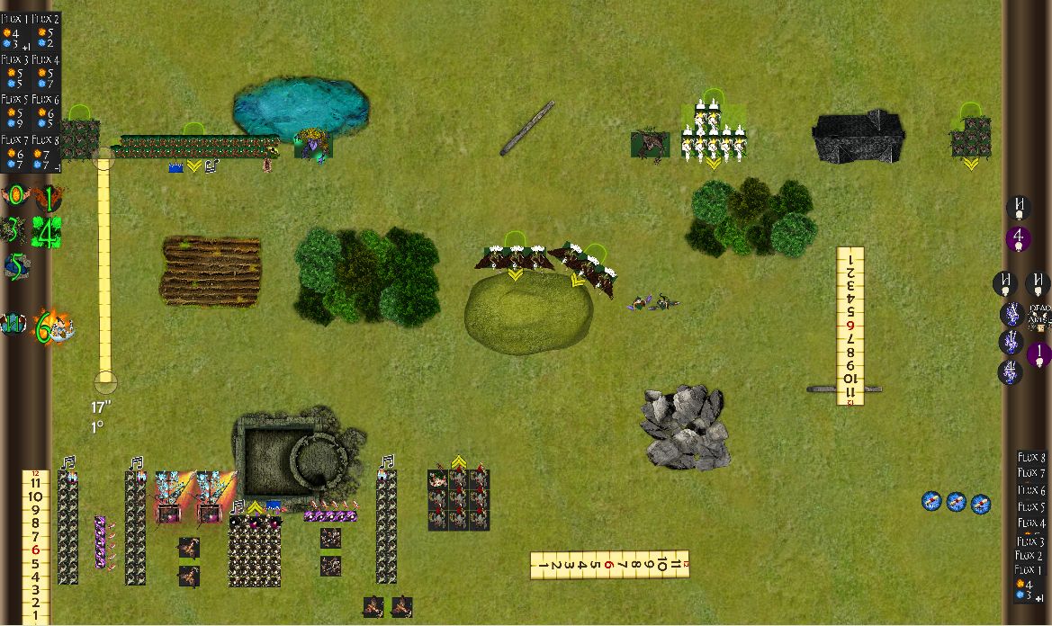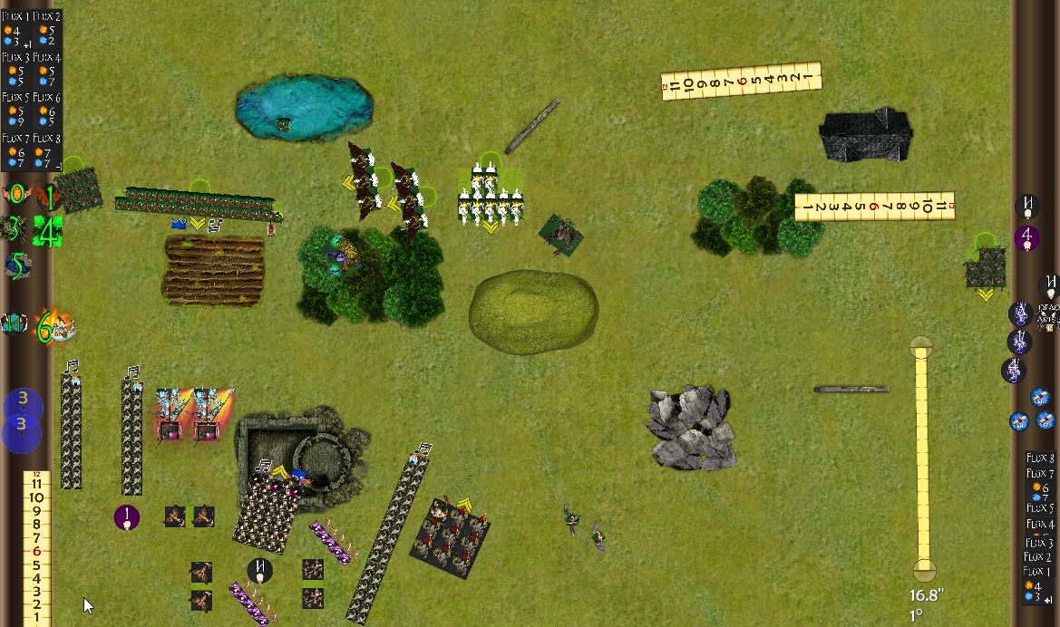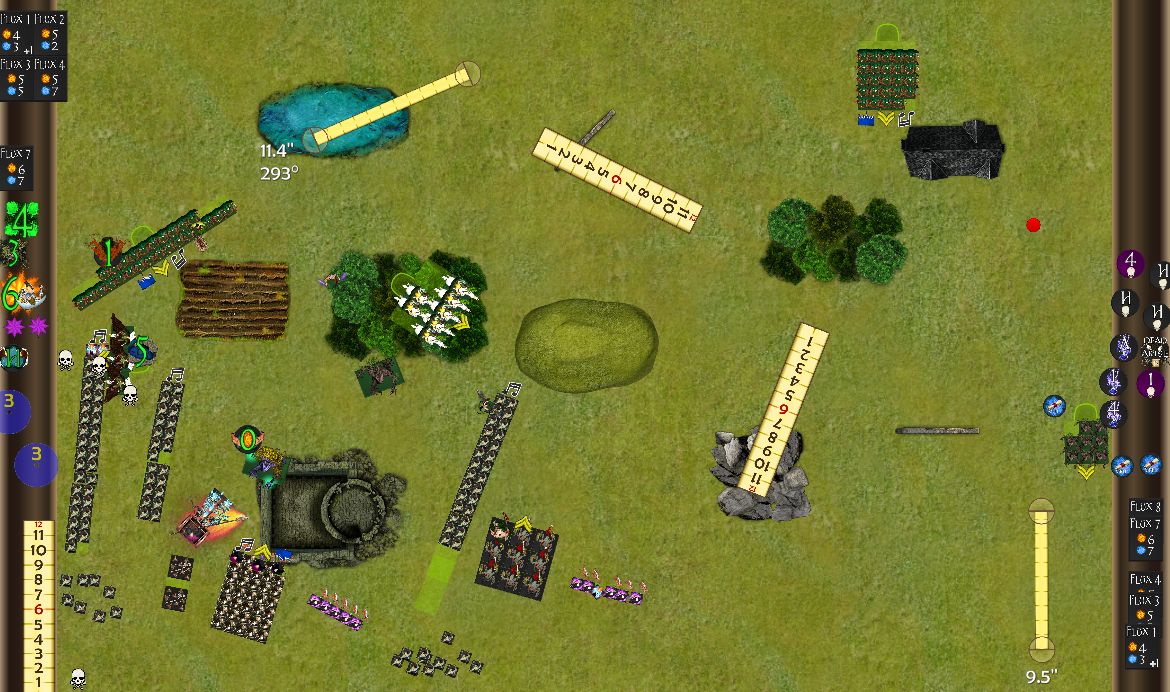 Lol, die Liste hat mehr Potential als ich anfangs dachte. Ich so "Hey, ne Runde zocken?" Er:"Ja gern!" Stellt Vampire hin... Schon das vierte Mal dass ich dagegen zocken muss. Eigentlich in jedem random Game auf UB in letzter Zeit, ansonsten hab ich nur gegen BH, DL und HBE vom Merlin und vom Matthias gespielt. Naja hilft nix, erstes Spiel mit der Liste, versuchen wir halt mal. In die andere Ecke hab ich mich dann auch nicht gestellt, dann hätten wir eh nicht spielen brauchen und den Durchbruch hätte er fix gewonnen. Also Archers direkt gegenüber von ihm, Altare totschießen, dicke Eier. Rest macht ein outflanking Manöver. Erstes Bild also nach meiner Vorhut. (Dryaden brechen durch ).