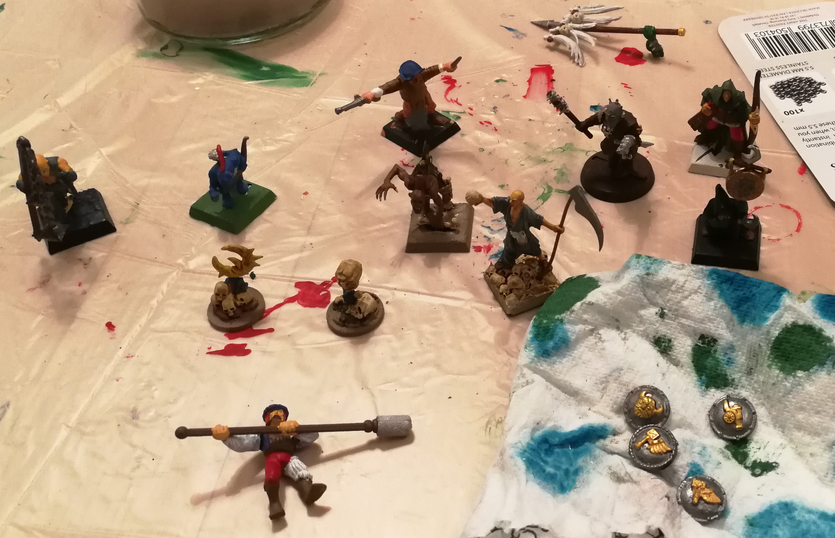 * und einige einzelne figuren die mir so untergekommen sind bzw fertiggemacht gehört haben, da sind gar nicht alle drauf... 3 flagellanten, ein necromancer von dem ich gar nicht wusste dass ich ihn hab (noch welcher hersteller), ein skink, ein chaos kultist, ein goblin, ein waldelf, bisschen imperium und ein ghoul (auch der hat eine kunst-spray grundierung gekriegt)... und noch ein wenig repariergeklebt.