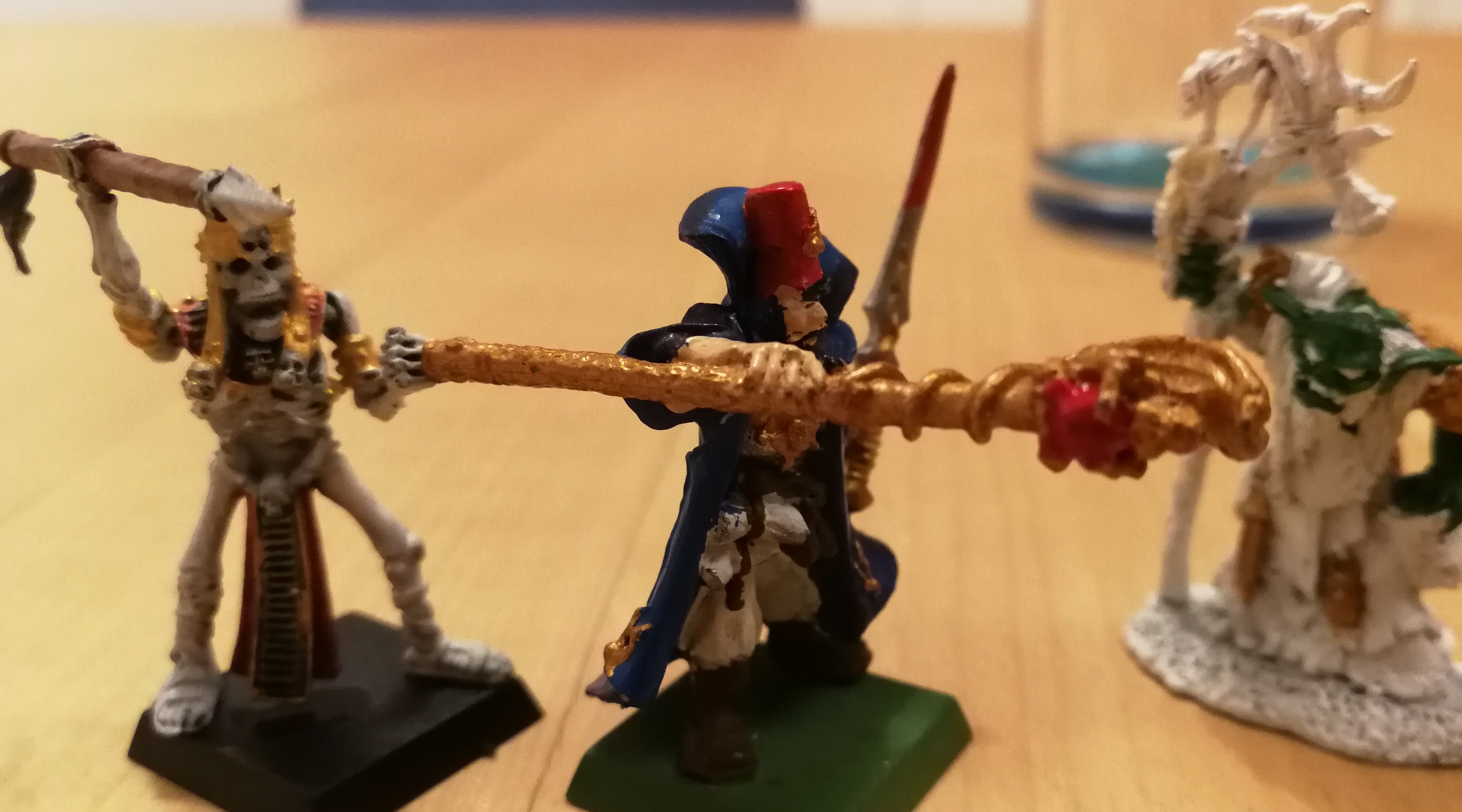 habe einen alten whfb magier repariert, war schon so abgeschlagen...ein "neuer" reaper ork-schamane grundiert und angefangen und... ein random skelett das nur so lieblos schwarz-weiß rumgelegen ist...