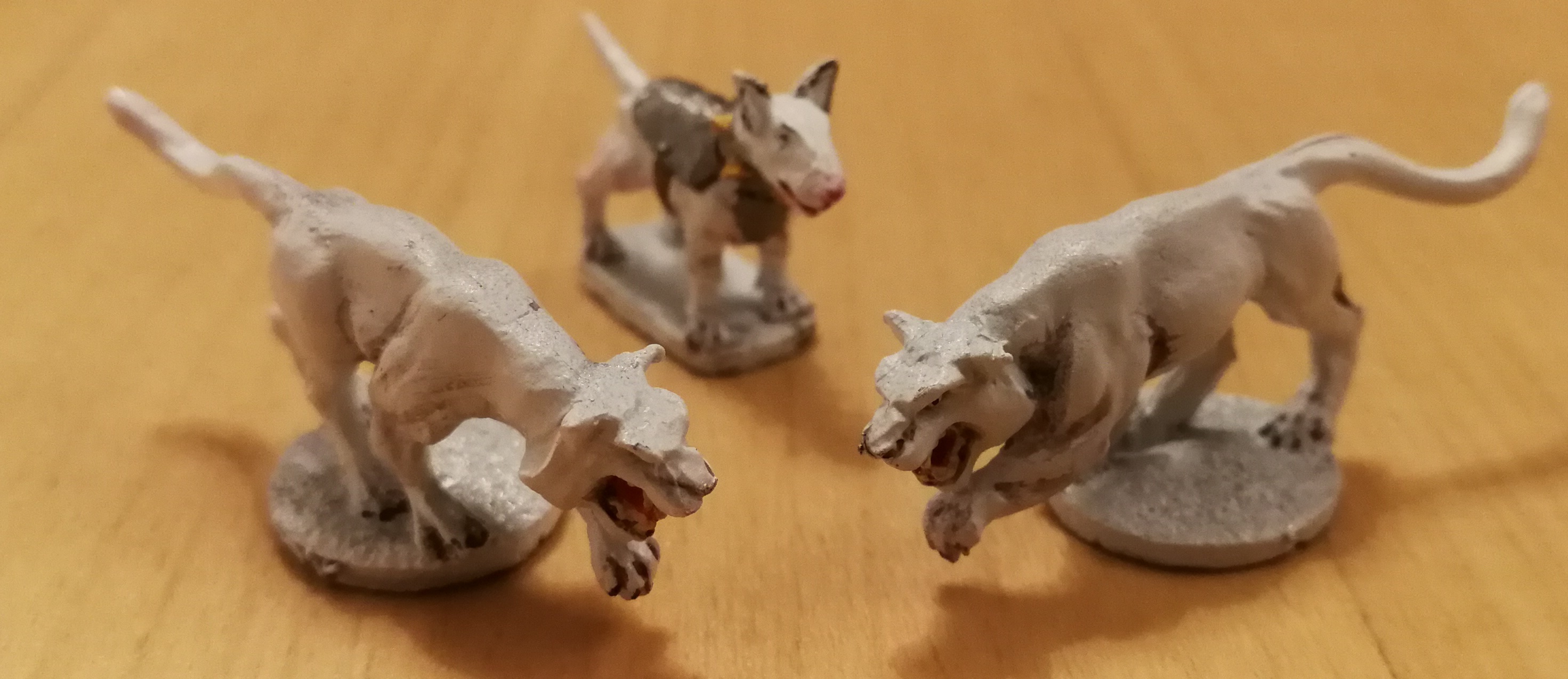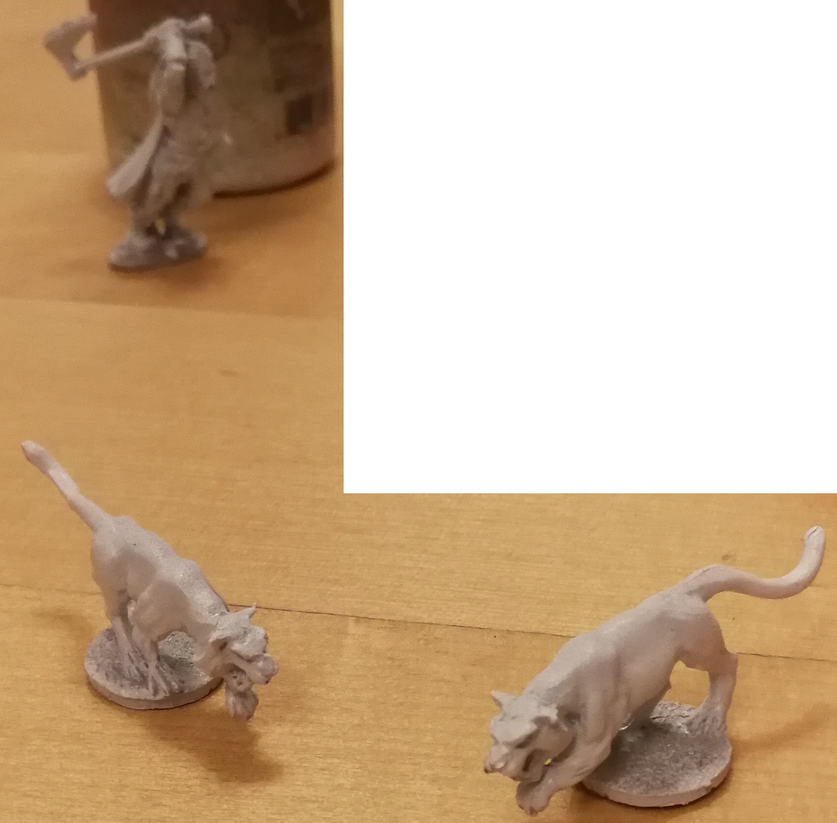 ein frostgrave-elch-schamane (schon braun grundiert) und die green lady (auch schon grundiert) und die frostgrave scout die bei dem schon fertigen hund dabei war....
