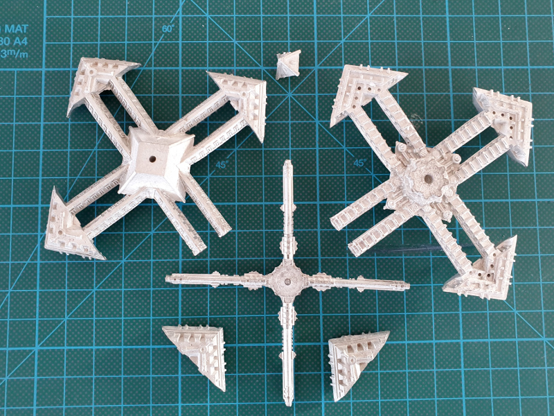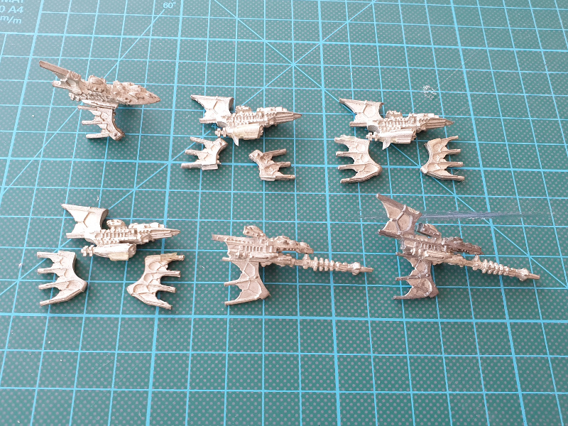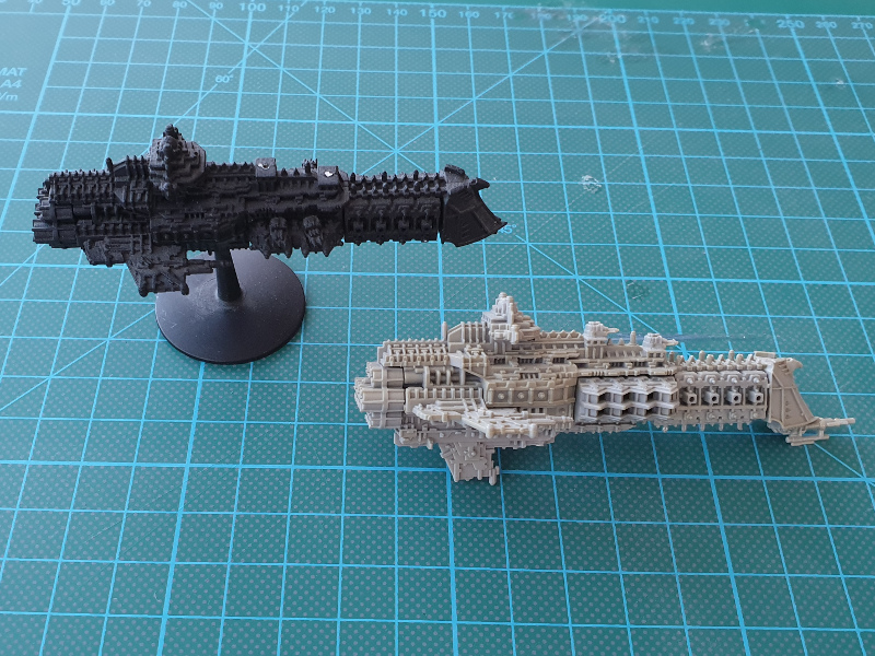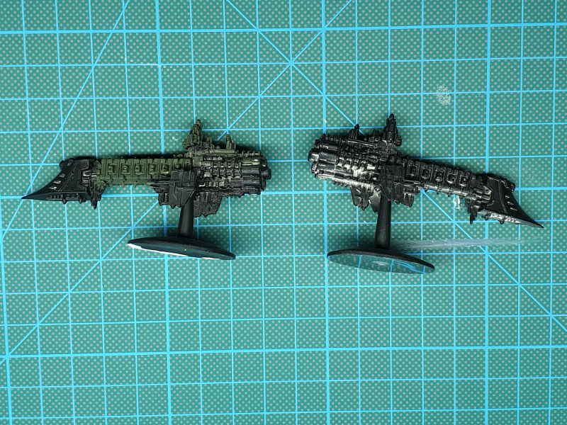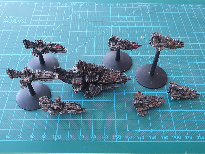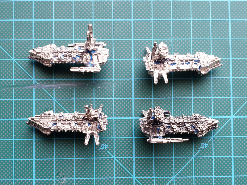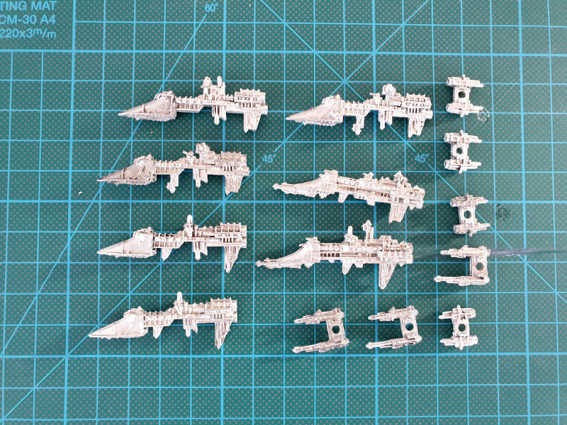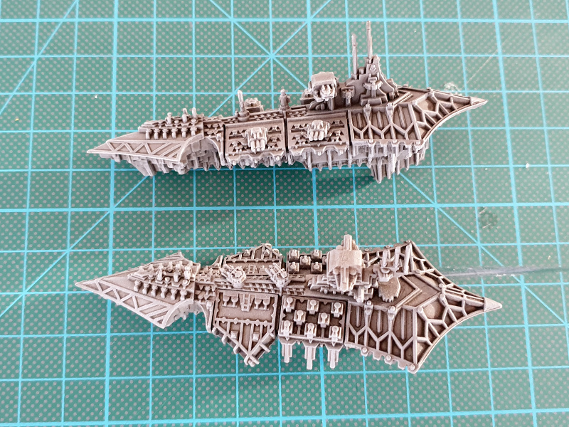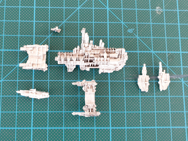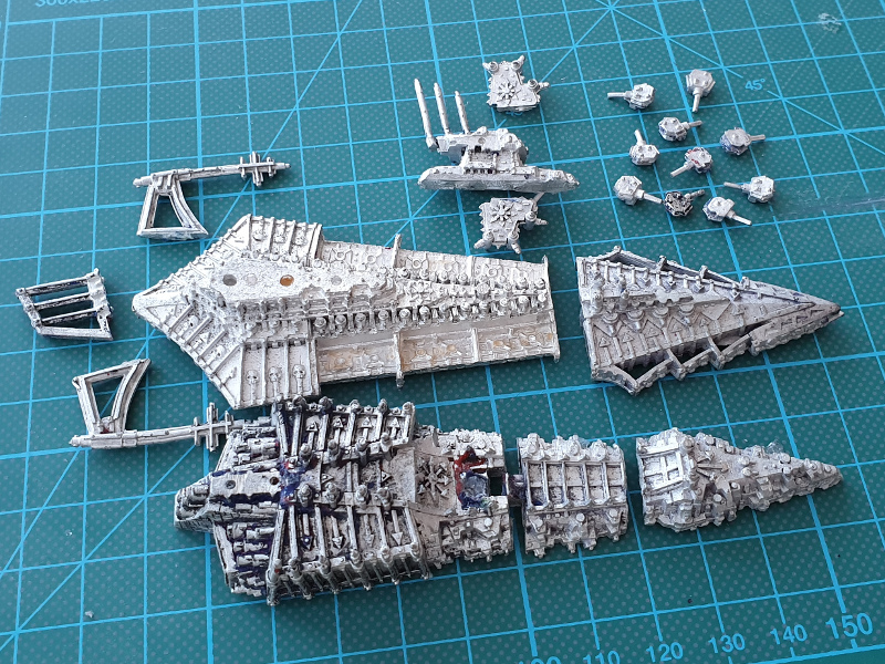 Die Schiffe sind soweit komplett - bei den imperialen Kreuzern sind Ersatzteile für die fehlenden Antennen usw. vorhanden aber beim Chaos-Desolatorschlachtschiff fehlen 2 Geschütztürme.