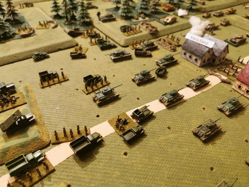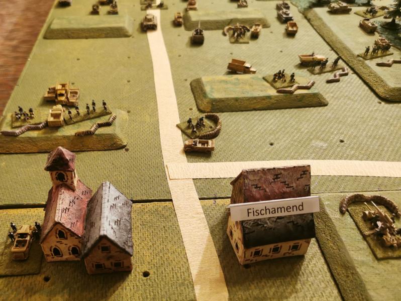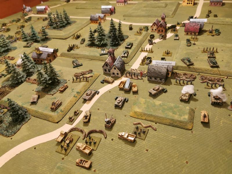 Am 26.10.2023 haben wir in meinem Spielkeller die Schlacht in der Brucker Pforte 1945 mit 10mm Figuren (1:200) achgespielt. Damit die Deutschen überhaupt eine Chance hatten, wurde jedoch angenommen, dass sich die 6. Panzerdivision darin auch einrichten konnte und nicht nur durchgejagt wurde. Um überhaupt in der taktischen Ebene spielen zu können, haben die Spielregeln einen Darstellungsmasstab, wobei ein Modell, Waffe oder Figurenbase eine Kompanie darstellt. Das Spiel endete aber anders als in Wirklichkeit damit, dass die Sowjets ihr Angriffsziel Schwechart nicht in der vorgegebenen Zeit nehmen konnte. Beigeschossen einige Bilder.