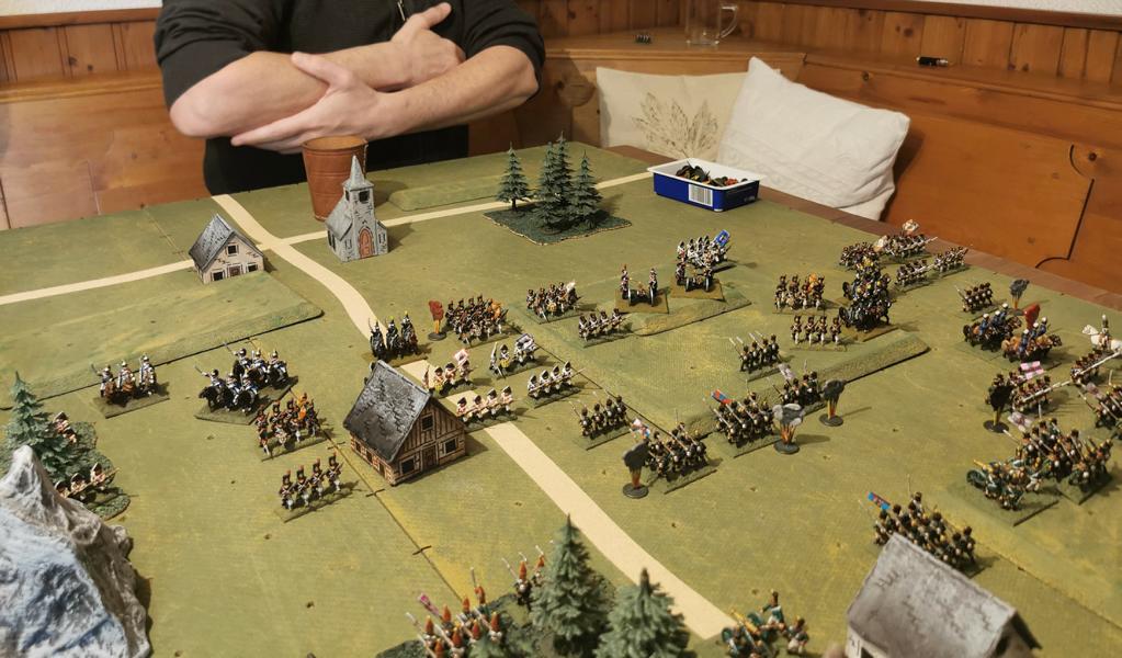 Am Samstag den 16.03.24 haben wir mit 6 Freunden einen fiktiven Übergang durch das Erzgebige nach der gewonnenen Schlacht bei Kulm 1813 in meinem Spielkeller gespielt. Aus spieltaktischen Gründen gab es 3 Gefechtsstreifen (je ein Pass) nach Norden. Auftrag der Alliierten (Österreicher und Russen) war es, den Übergang Richtung Norden (Dresten) wieder zu gewinnen. Auftrag der Franzosen war es dies zu verhindern. Den Franzosen gelang es die Alliierten wieder in den Raum Kulm zurückzuwerfen. Ein spannendes Spiel.