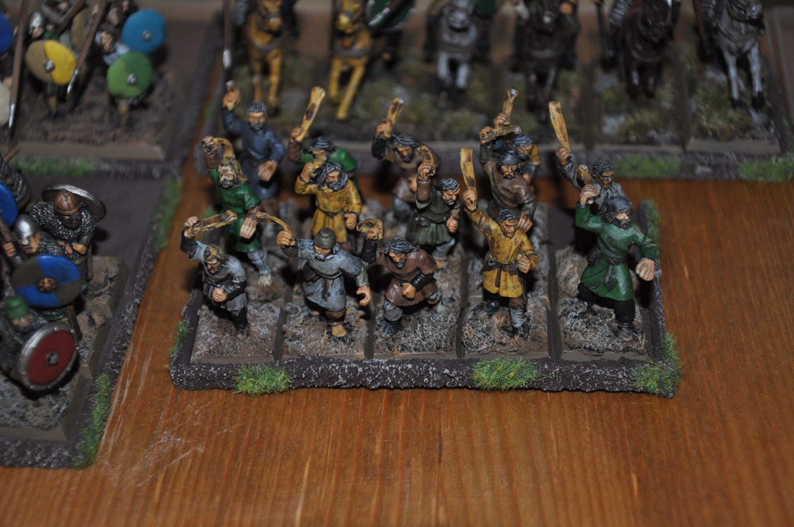 in diesem Fall handelt es sich um ein Multibase mit bauern ( genannt Ceorls ), ich versuche die Farben dr Kleidung eher gedeckt zu halten und mich an mögliche "Vorbilder" zu halten die man in einschlägiger Literatur findet....die Schilde sind eher bunt und oft geteilt, haben auch schon mal kreuze drauf..mehr dazu bei anderen Modellen...leider, leider habe ich erst beim Malen bemerkt dass ich phasenweise nicht alle Gußgrate entfernt habe...deswegen muss der eine herr dessen gesicht man gut sieht nochmal zur OP....