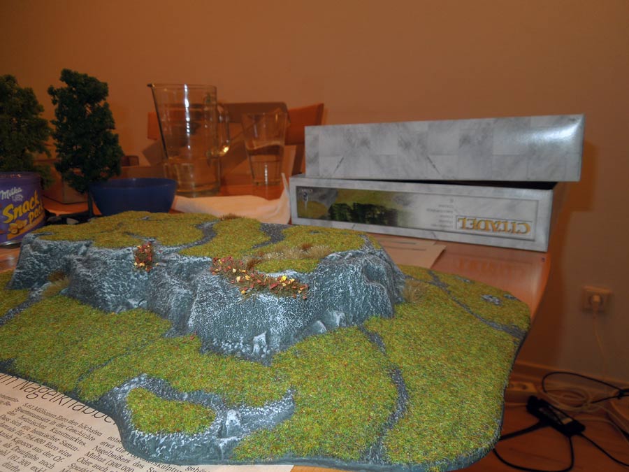 bezüglich spielplatte an sich, tendiere ich im moment zu der schnellen variante der spielmatte von gw. also styrodurplatte und einfach drüber die grüne spielmatte von gw. klarer vorteil hierbei, ich kann die spielmatte, wenn nicht gespielt wird, einfach staubsicherer verpacken und ich erspare mir am anfang das kleben.