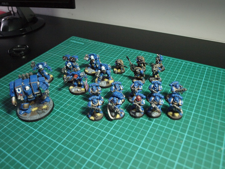 Eine kleine, gut bemalte Ultramarines Streitmacht bestehend aus 5 Terminatoren, 10 TT, 5 Scouts und einem Cybot