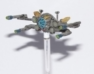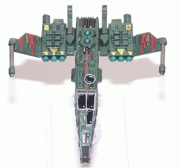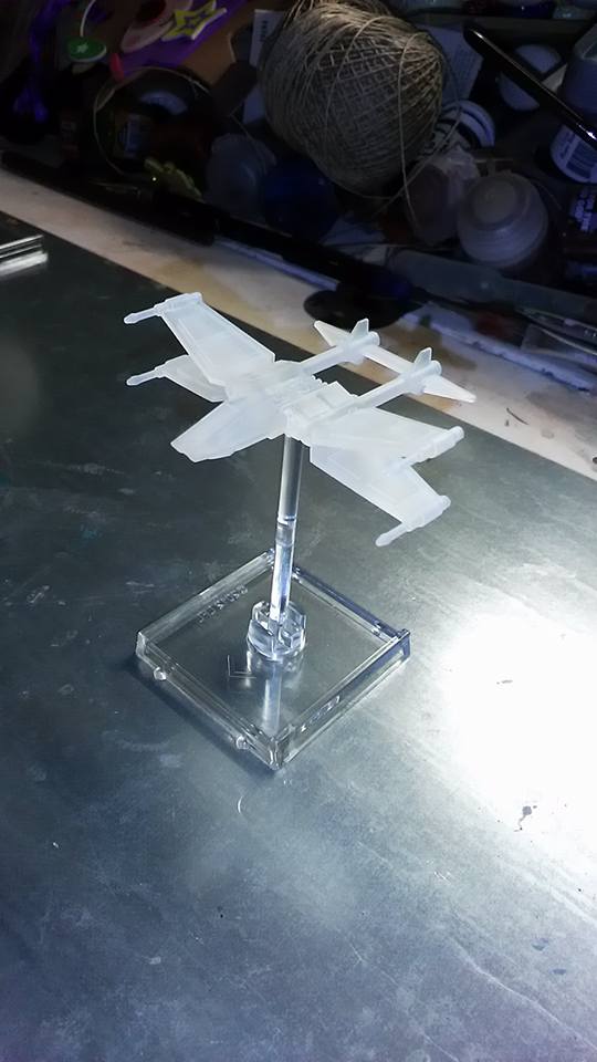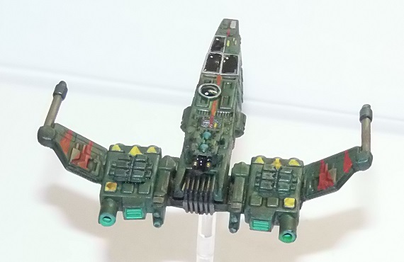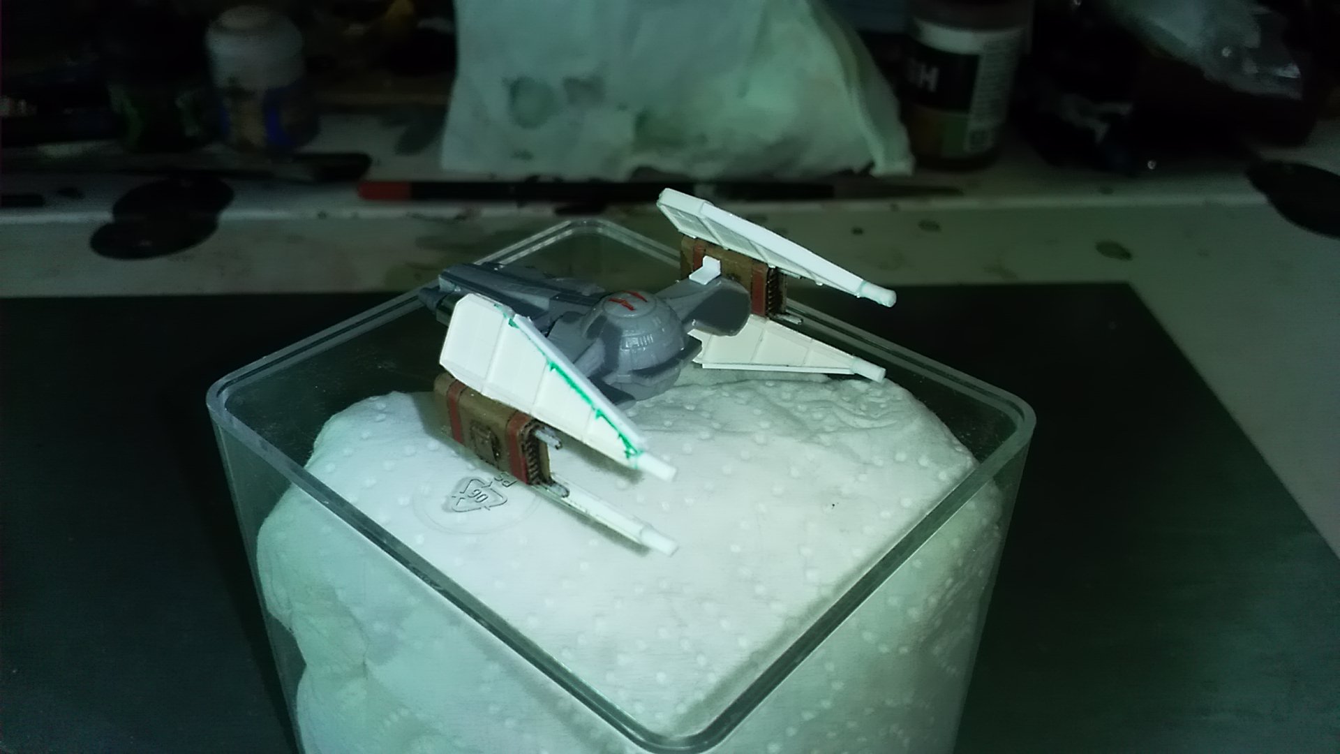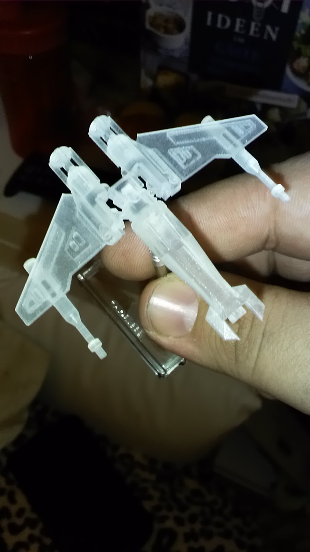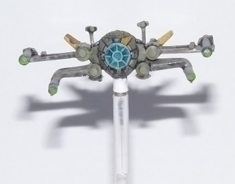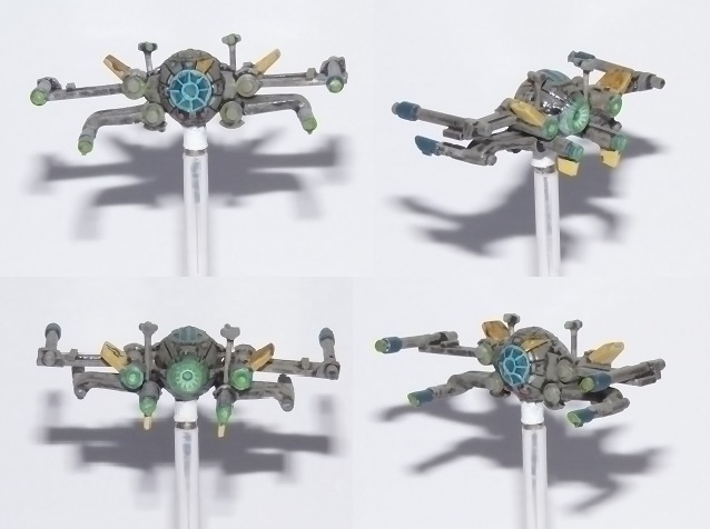 Grundgerüst war eine alte Micromachines Figur, habe dann anschließend mit übriggebliebenen Teilen einen verstärkten Antrieb gebastelt und auch eine Sensorphalanx. Die Flugstabilisatoren habe ich aus Finnen einer alten Lenkrakete gemacht und die Laserkanonen sind Teile von verschiedenen X-Wings. Die Base Halterung ist sogar magnetisch dass ich immer wieder auswechseln kann.