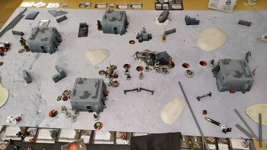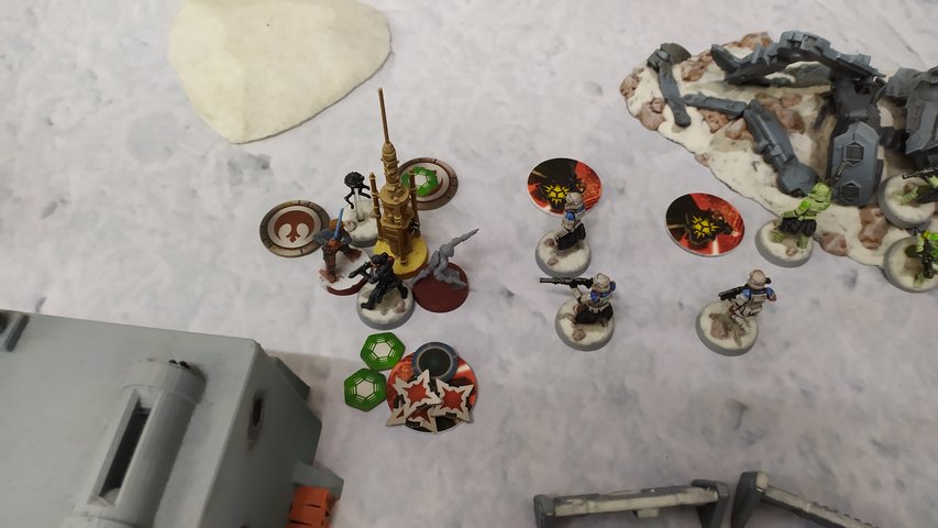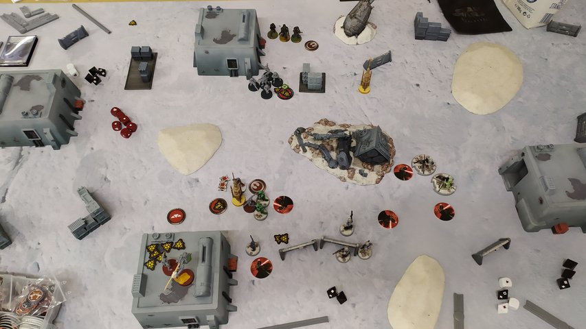 In Runde 1 verscheuchen meine ISF die Trooper bei der Kapsel. Iden und Gideon scoren am zentralen Vaporisator. Iden bekommt eine Wunde von den Mandos, diese kassieren selbst 2 Wunden von Gideons Snowtroopern. Die Rebellen nutzen die Dunkelheit und rushen auf der linken Flanke vor.