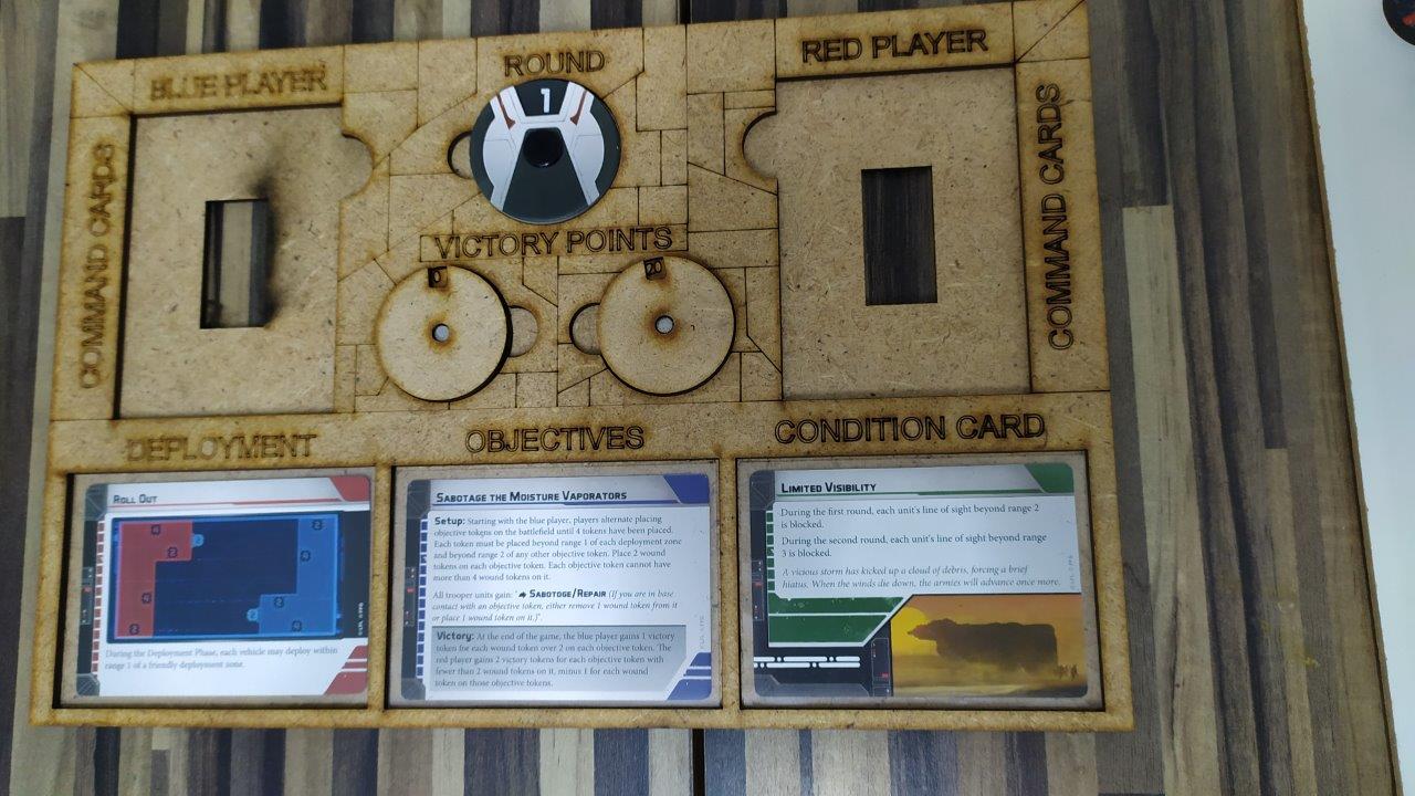 Ich verweigere ihm, dass er seine Vaporatoren nah beieinander platzieren kann und über R2 gewinnt. Mittels Infiltrate dominiere ich schon zum Start 3 Vaporatoren. Ich musste diese nur halten, um zu gewinnen. Eigentlich Voraussetzungen, die das Imperium gerne hat. Aber Limited Visibility gegen Luke/Sabine/Wren/Tauntauns ist schon auch eine Ansage! Die Kare war auf Platz 3, konnte ich nicht verhindern ...