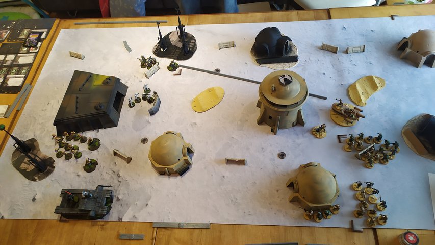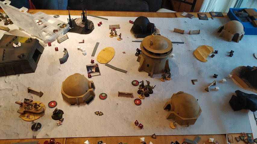 Der Aktivierungsvorteil geht voll auf und ich fahre mit dem Speeder als vorletztes vor und nehme einen Mörser raus. Han schießt noch 2 Modelle der Scouts raus und gibt einem zweiten Mörser eine Wunde. Ich stehe aber nun zentral da. Das ging nicht besser, weil die oberen Shores im Standby waren.