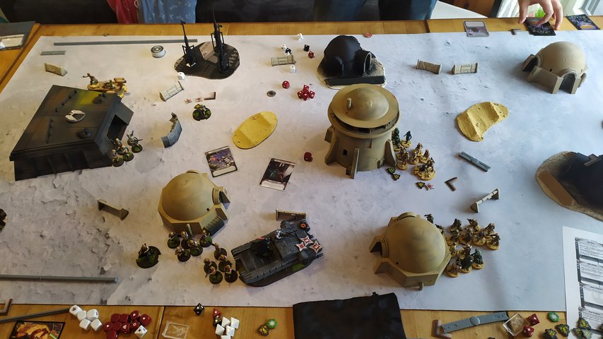 In Runde 5 kalkulieren wir kurz durch: Vader und einmal Shoretrooper kommen in die Endzone. Das kann Han im Speeder locker kompensieren. Es gibt noch einen Hauch einer Chance, wenn Vader die Veterans vom Scoren abhalten kann und mir mehr Schaden zufügt als ich ihm. Vader schubst sie also ins Gelände und suppressed mittels Lichtschwertwurf. Sie schaffen nicht sich zu erholen. Wenn also nächste Runde der Mörser noch drauf schießen kann, kämen sie nicht in die Endzone. Dazu muss der Mörser mit 1 HP aber die Runde überleben. Tut er nicht. Also gewinne ich über das Szenario. Wahrscheinlich hätte ich auch über Killpoints gewonnen, so genau haben wir aber nicht nachgezählt.