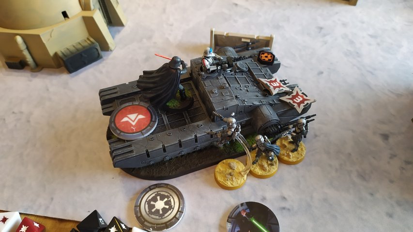 Aber auch der Panzer kommt ins Spiel. Er schießt mir einen Mando raus. Diese chargen im Anschlus in die Flanke des Panzers und legen noch 2 Wunden drauf, fehlen noch 2. Aber nun kommt Vader. Er fügt als erstes meiner kompletten Armee 3 suppression zu (weswegen mein restlicher Zug hauptsächlich daraus besteht, auszurasten) und schneidet mir im Anschluss die Mandos um. Eine Wunde krieg ich dann noch auf den Panzer durch und das Imperium läuft vor in Richtung meiner Aufstellungszone.