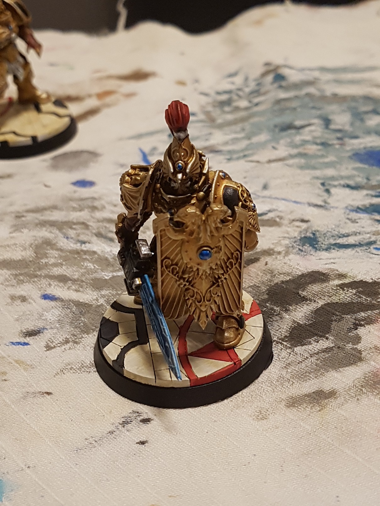 Die Zinn St Celestine ist grundiert und kriegt das Farbschema meiner anderen Sororitas. Das Spezialbase ist auch schon fertig. (selber kreiert)