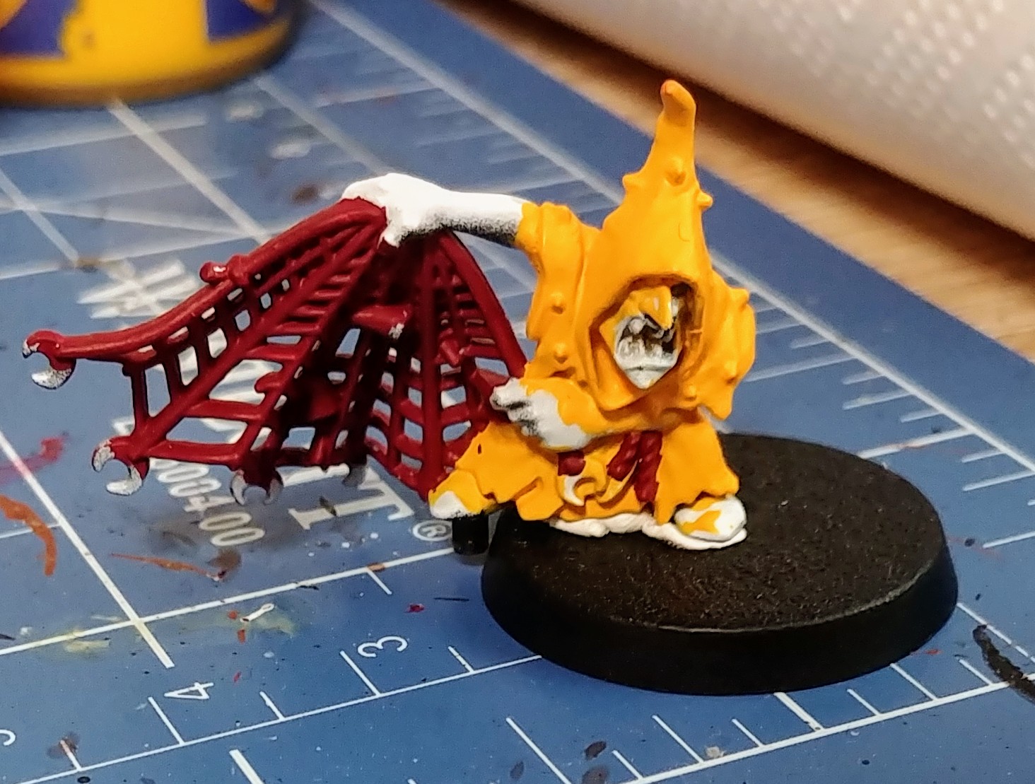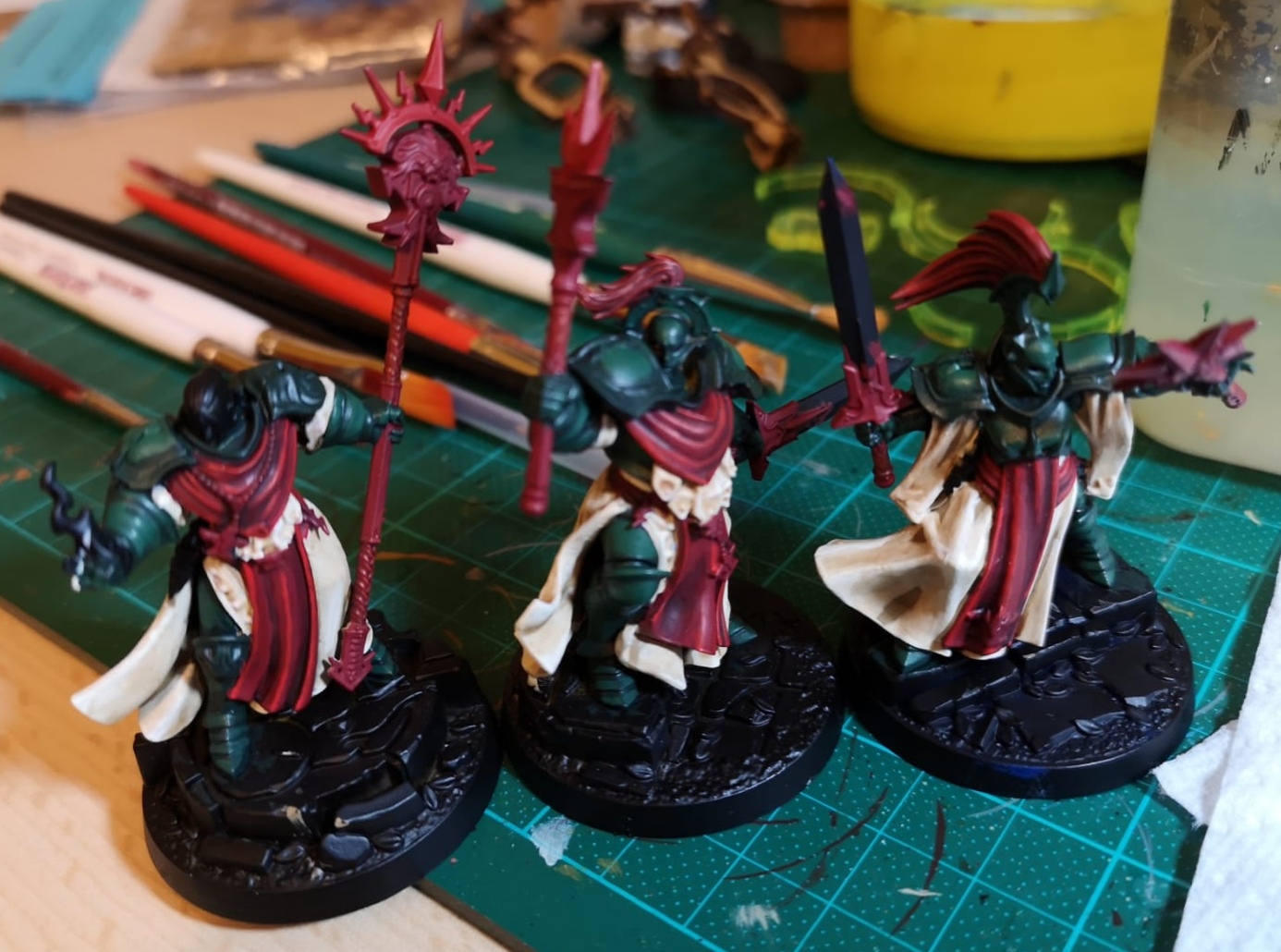 Die Plastik St Celestine und ihre Begleiterinnen sind zusammengebaut und grundiert. Beim Farbschema bin ich noch am überlegen. Sie kriegen natürlich auch schönere Bases.