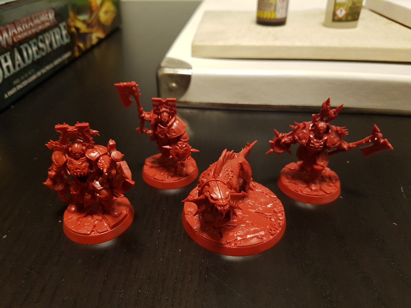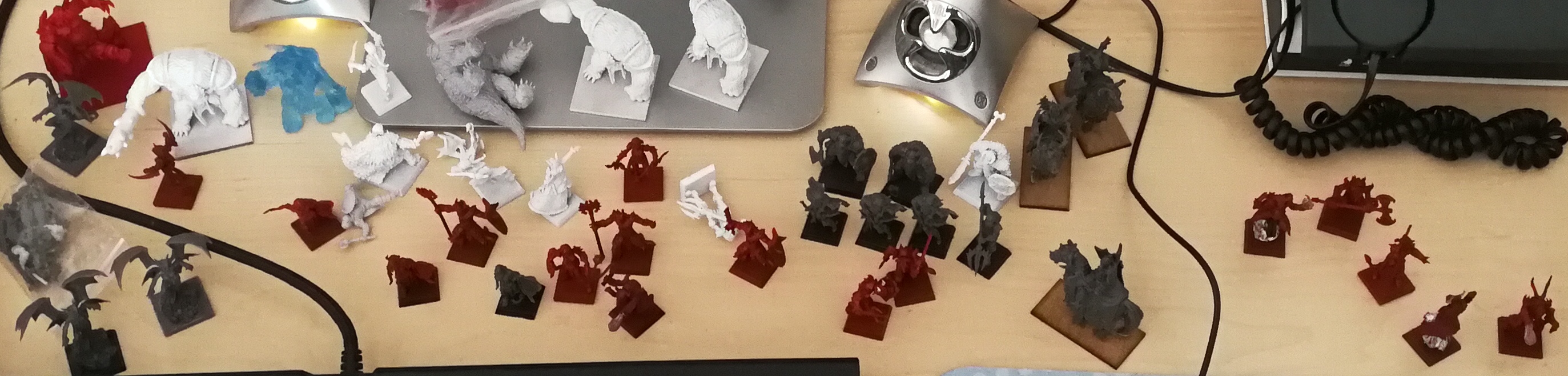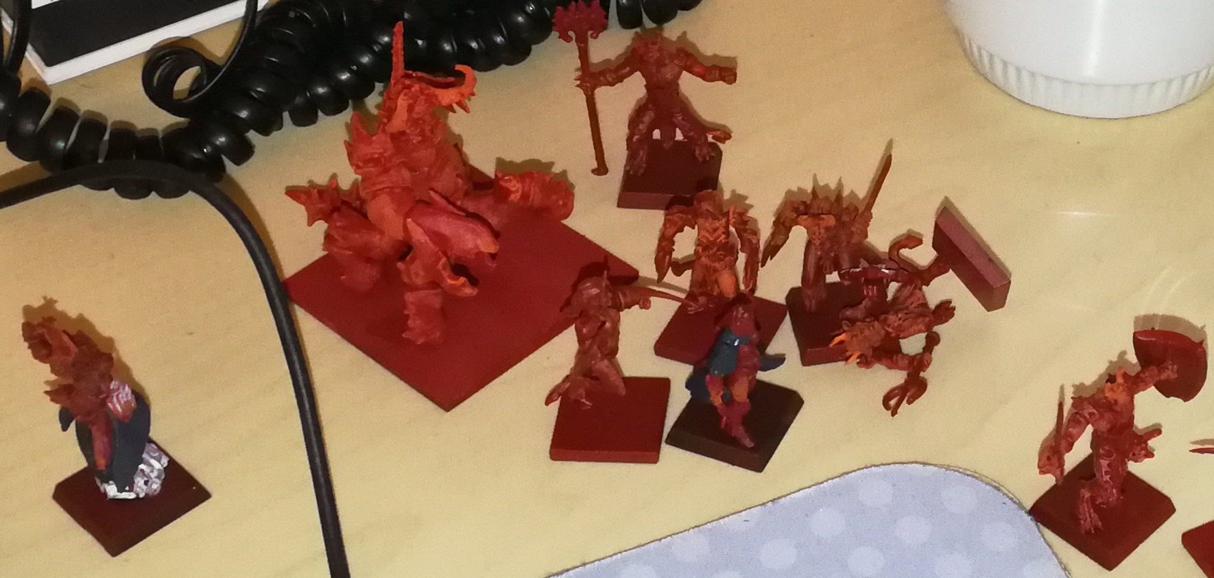 abyssals und northern alliance zu großen teilen grundiert. bei den abyssals gabs ne sauerei weil das army painter spray irgendwie undicht wurde, ich dann alles versprühen musste bevor das ganze gas draußen war... und teilweise hatte ich dabei dann unschön dicke farbschichten im stress... und eines dann noch auf meinem charakter-succubus modell