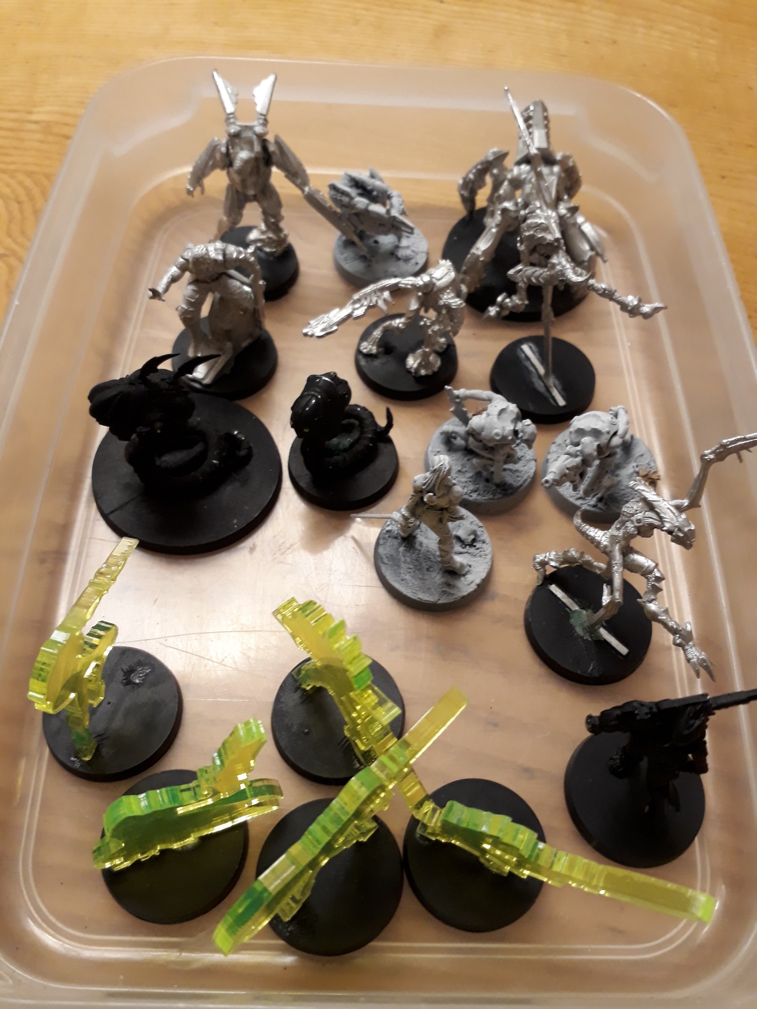 * und einige einzelne figuren die mir so untergekommen sind bzw fertiggemacht gehört haben, da sind gar nicht alle drauf... 3 flagellanten, ein necromancer von dem ich gar nicht wusste dass ich ihn hab (noch welcher hersteller), ein skink, ein chaos kultist, ein goblin, ein waldelf, bisschen imperium und ein ghoul (auch der hat eine kunst-spray grundierung gekriegt)... und noch ein wenig repariergeklebt. -