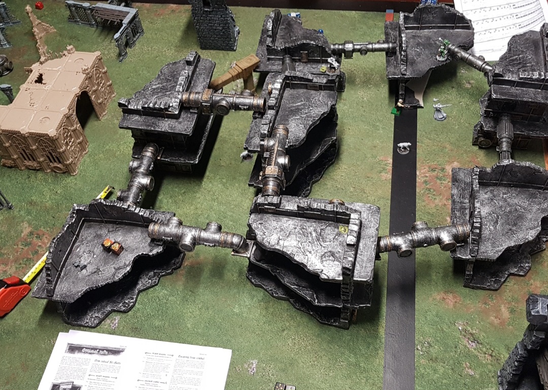 Wie spielen auf der Platte mit der großen Kathedrale. Er liegt die Mortstein Splitter einmal ins offene Gelände und einen aufs Dach der Kathedrale ich lege einen auf einen zwischenstufe und einen recht nah am Spielfeld Rand