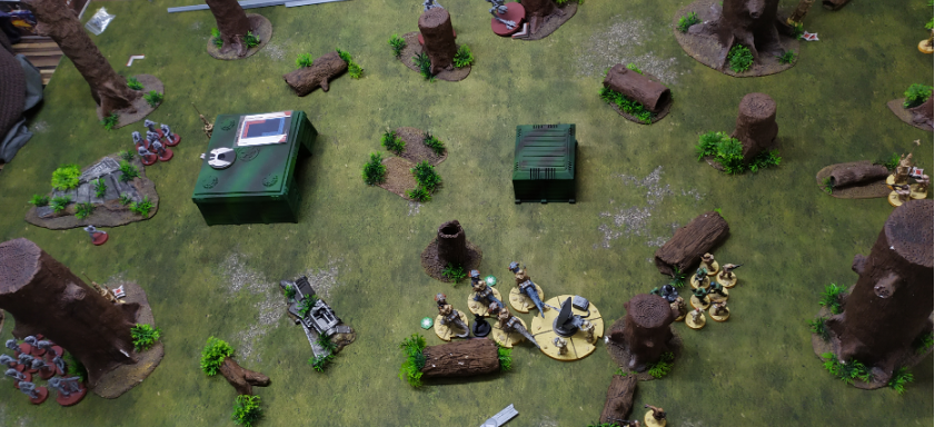 Bartosz beging jetzt leider einen groben Fehler und schoss auf die Tauntauns mit vollem Leben und Ausweichmarker. Dank dem Marker und ziemlich brutalen Rüstern bekam der Tauntaun Trupp nur 2 Wunden. Danach ist ihm aufgefallen das er hätte einen Trupp Tauntauns auslöschen können. Zu spät denn die Tauntauns wurden aus dem Beutel gezogen (dank Improvised Orders) aktivierten gingen 2x volle 3 Bewegung (2 Ausweichmarker) und schlugen einen von Snipern angeschlagenen Trupp zu Brei.