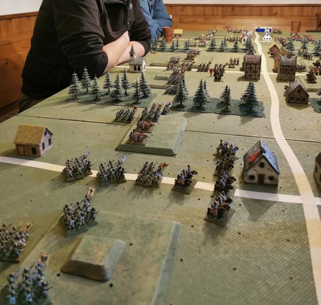 Am Samstag den 22.01.22 haben wir wieder in meinem Spielkeller in Vöslau ein Spiel nach den "Wiener Napoleonregeeln" mit 15mm Figuren duchgeführt. Wir spielten in Anlehnung an das Gefecht 1805 bei Haslach. Wir spielten in 3 Gefechtsstreifen West, Mitte, Ost jeder mit etwa einer Division/Spieler. Beiderseitige Siegesbedingung war es, mehr Siegespunkte aus der Feind zu gewinnen. Am Spielende gewannen schließlich die Franzosen mit einem Siegespunkt mehr und sie haben die Österreicher zum Rückzug nach Ulm gezwungen.