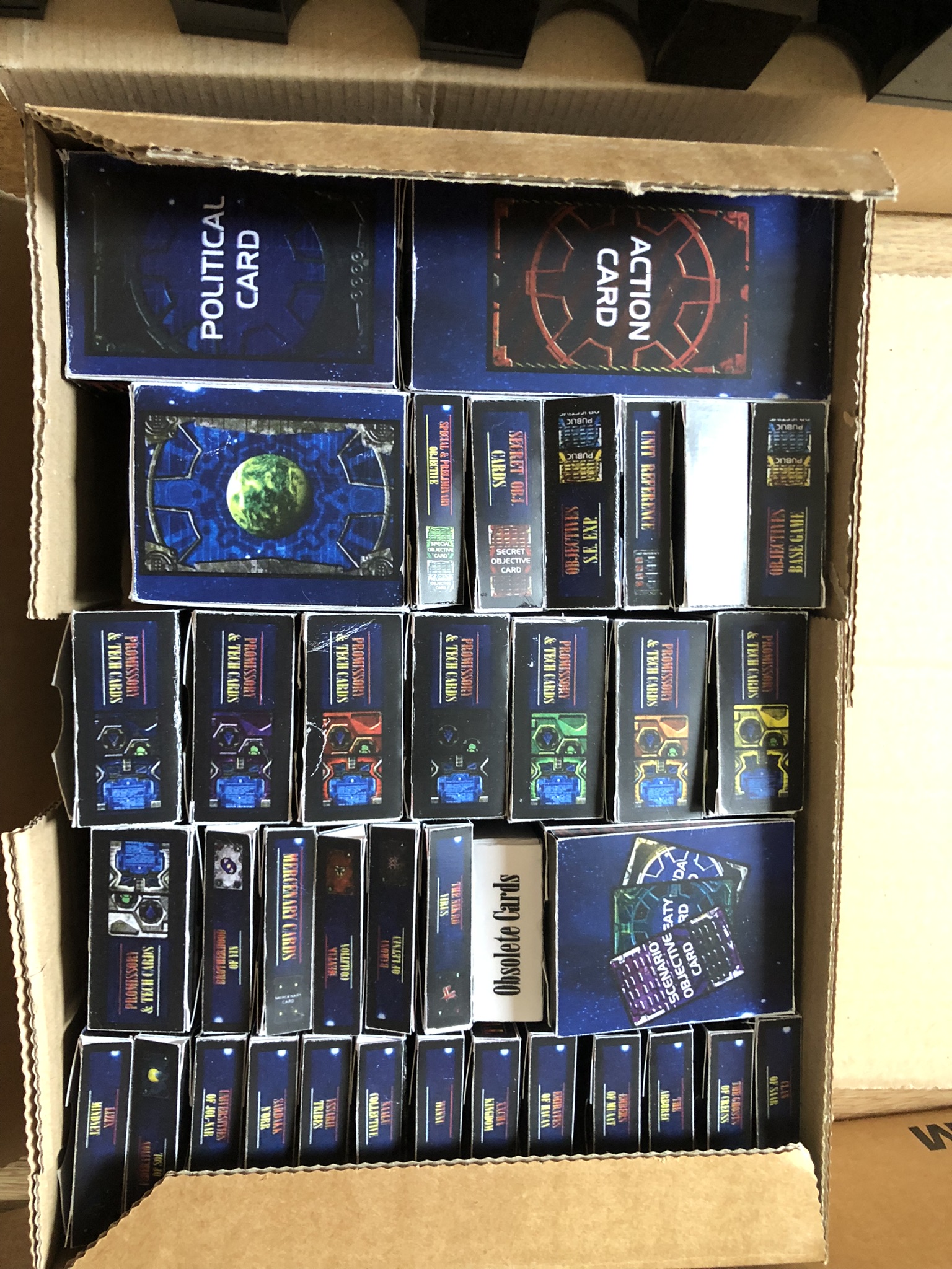 - Pap-schachteln für die Action Cards, Political Cards, Planet Cards, Tech Cards, Promissory Cards, Race Cards