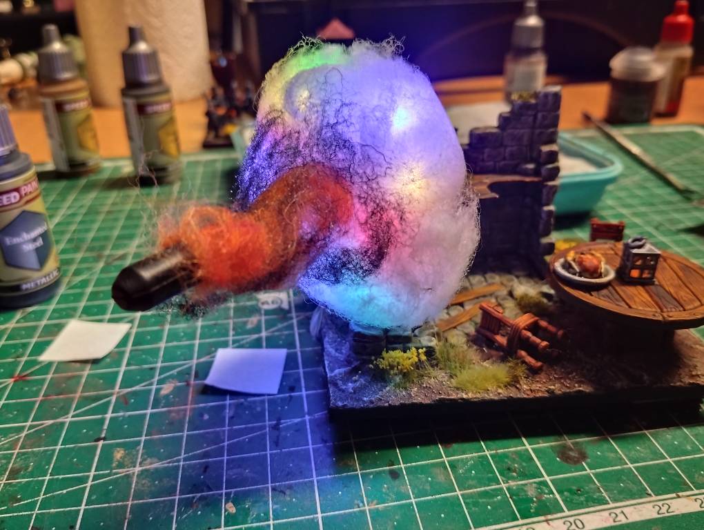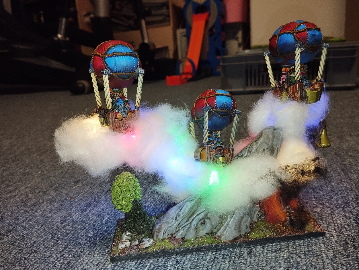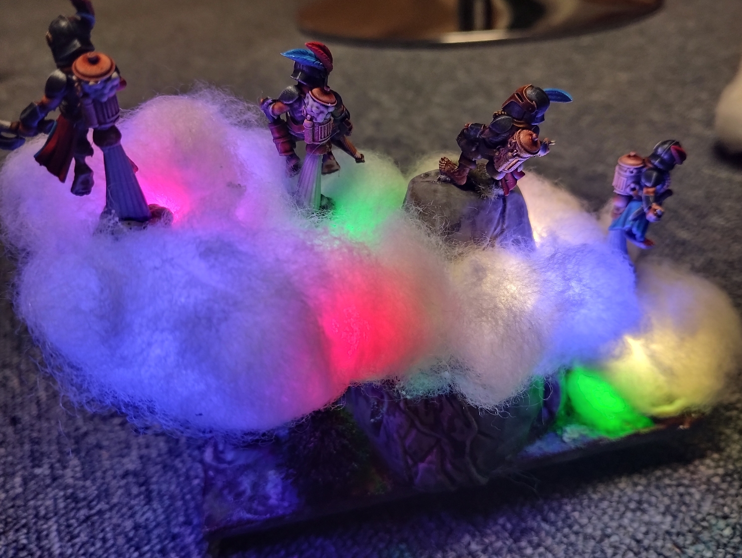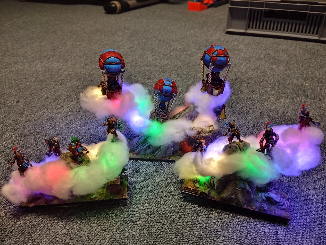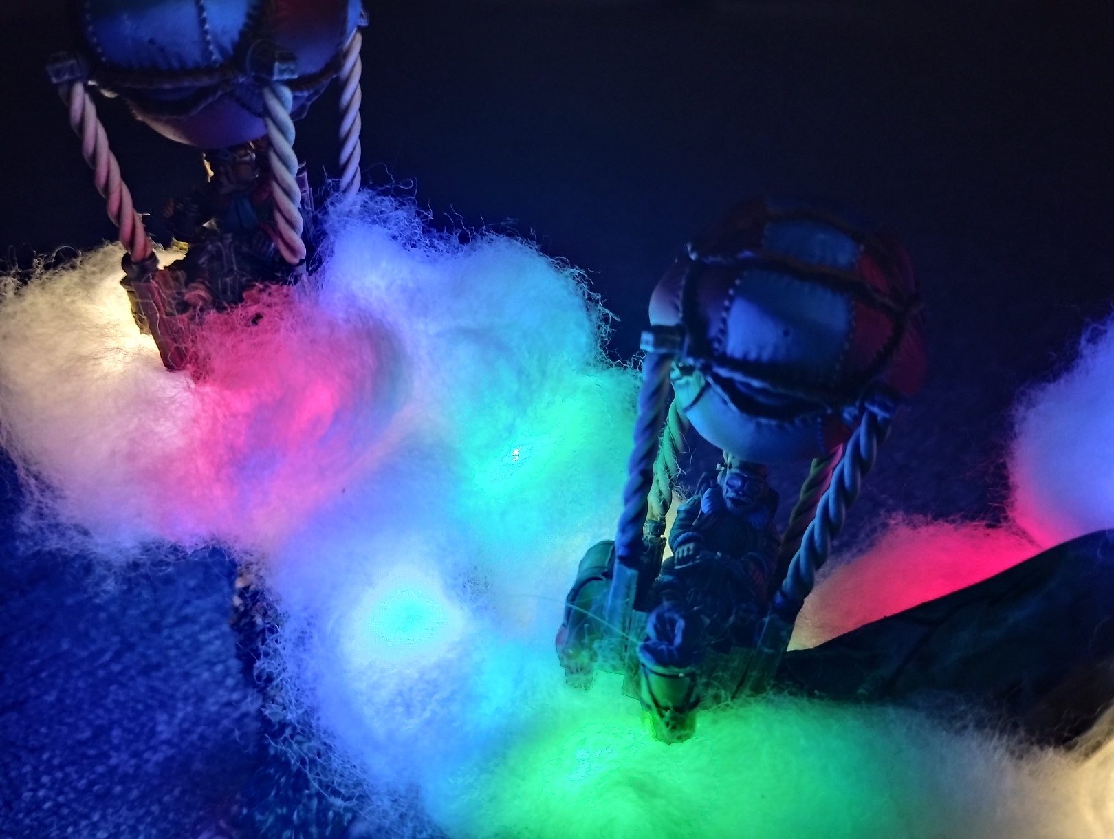 Begonnen habe ich dann auch gleich mit einem Regiment Ej Grenadiers und mir haben die Wolkenbases im Internet nicht gefallen. Ich hatte dann die Idee, dass ich unten 5 bis 6mm Gelände hingebe und die fliegenden Einheiten, dann über Wolken platziere. Dann habe ich noch DioramenYouTubes gesehen, wo LED Lichter eingebaut wurden. Diese habe ich dann noch hinzugefügt!