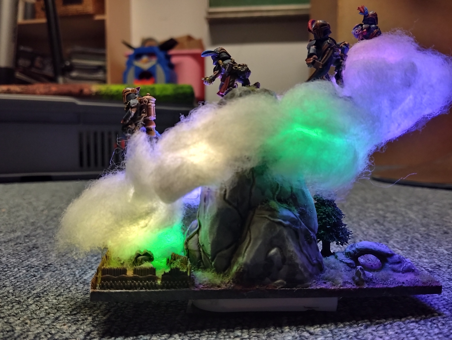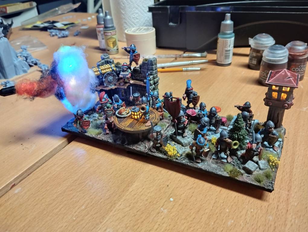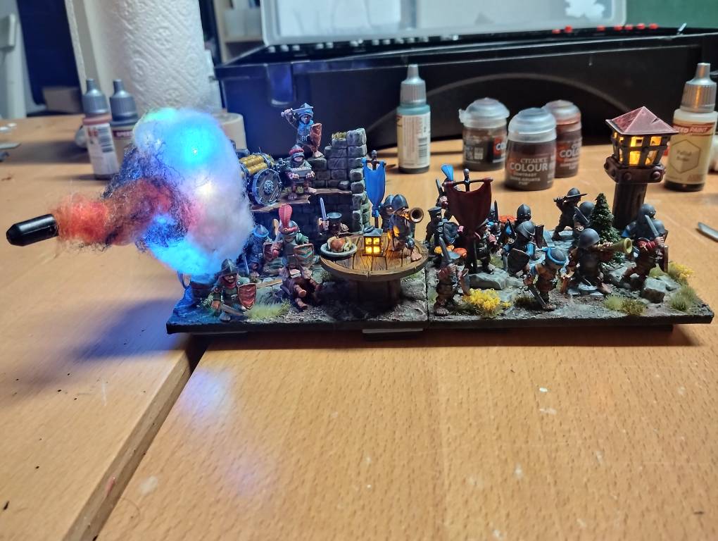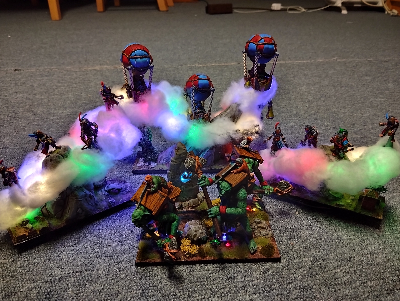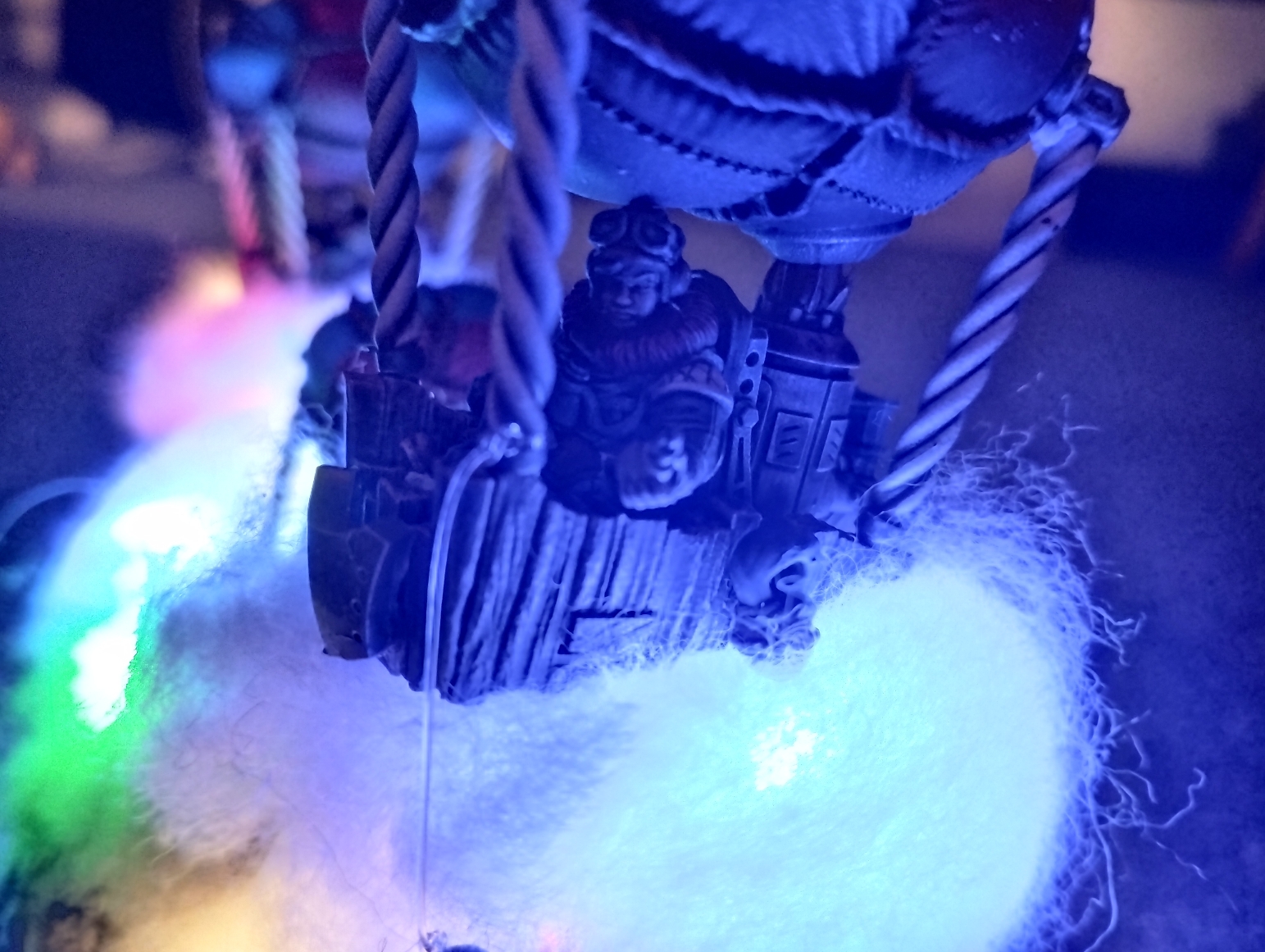 Begonnen habe ich dann auch gleich mit einem Regiment Ej Grenadiers und mir haben die Wolkenbases im Internet nicht gefallen. Ich hatte dann die Idee, dass ich unten 5 bis 6mm Gelände hingebe und die fliegenden Einheiten, dann über Wolken platziere. Dann habe ich noch DioramenYouTubes gesehen, wo LED Lichter eingebaut wurden. Diese habe ich dann noch hinzugefügt!