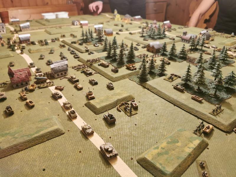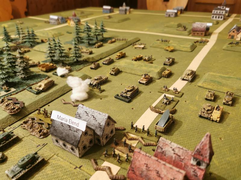 Am 26.10.2023 haben wir in meinem Spielkeller die Schlacht in der Brucker Pforte 1945 mit 10mm Figuren (1:200) achgespielt. Damit die Deutschen überhaupt eine Chance hatten, wurde jedoch angenommen, dass sich die 6. Panzerdivision darin auch einrichten konnte und nicht nur durchgejagt wurde. Um überhaupt in der taktischen Ebene spielen zu können, haben die Spielregeln einen Darstellungsmasstab, wobei ein Modell, Waffe oder Figurenbase eine Kompanie darstellt. Das Spiel endete aber anders als in Wirklichkeit damit, dass die Sowjets ihr Angriffsziel Schwechart nicht in der vorgegebenen Zeit nehmen konnte. Beigeschossen einige Bilder.