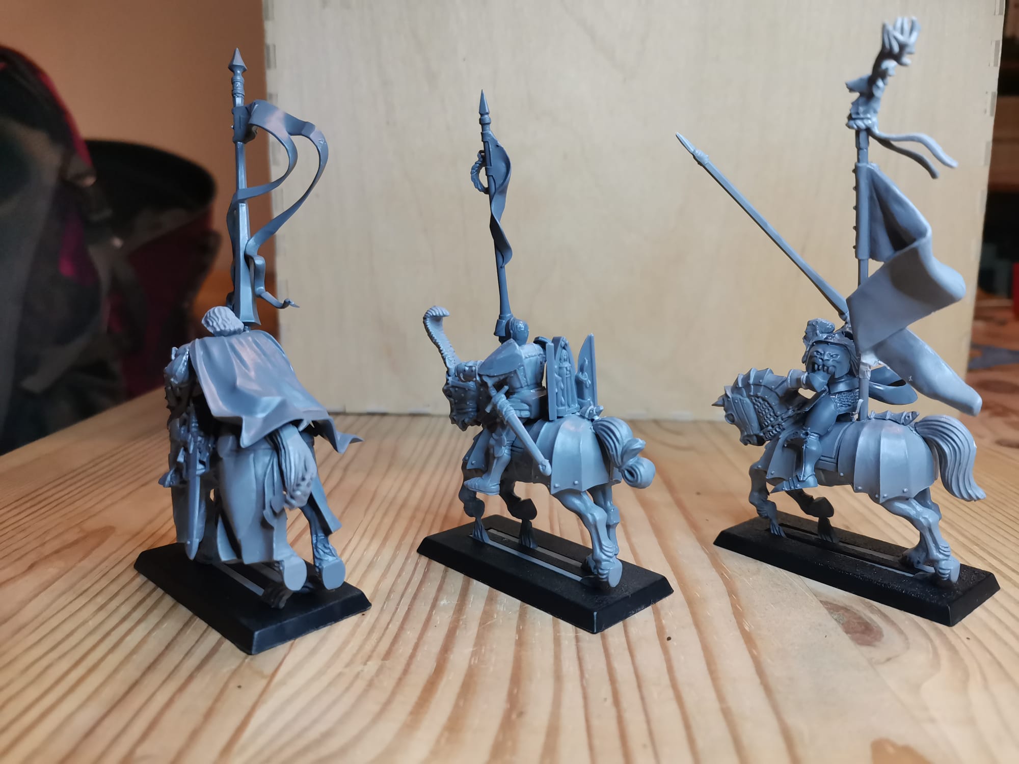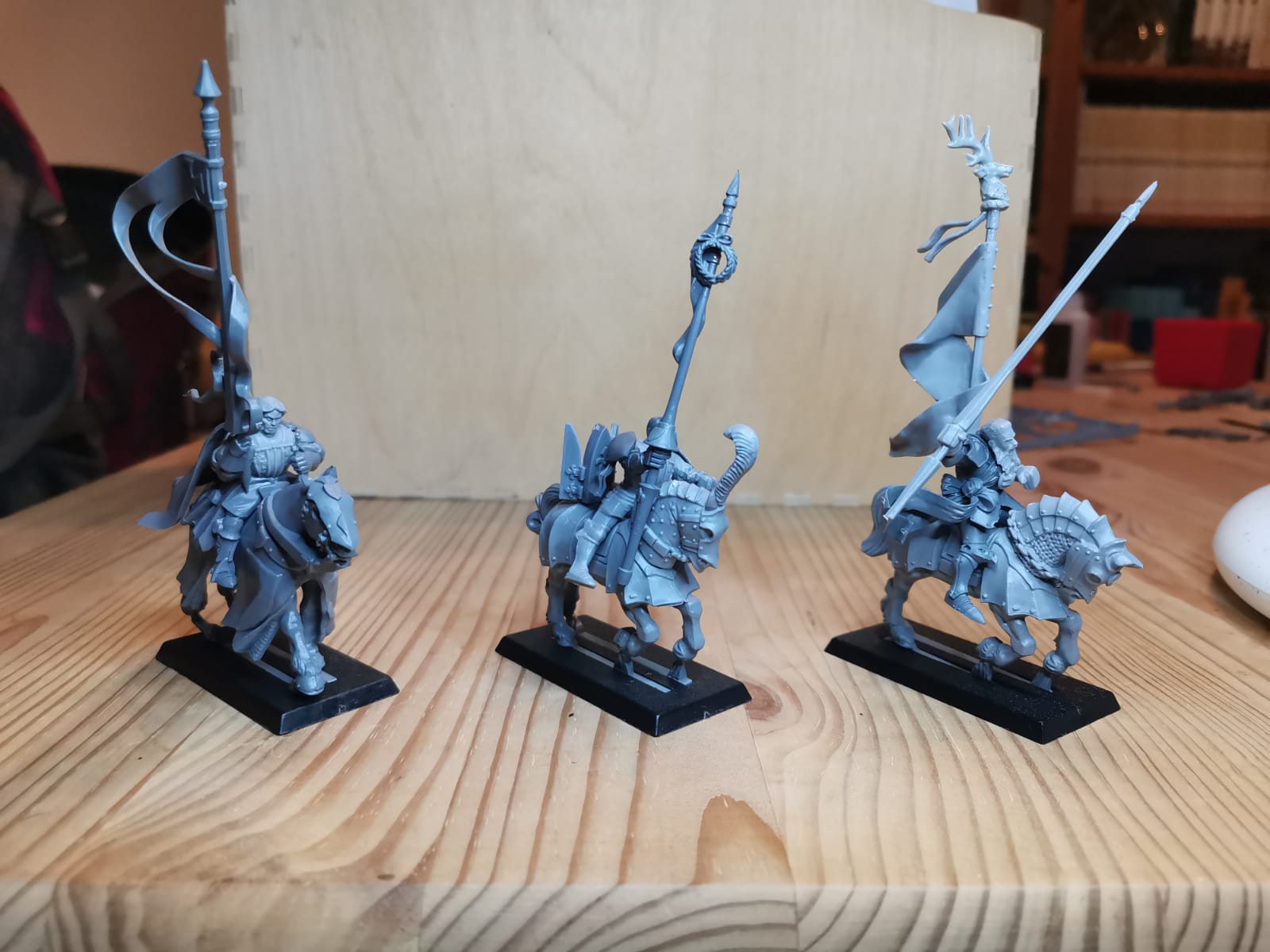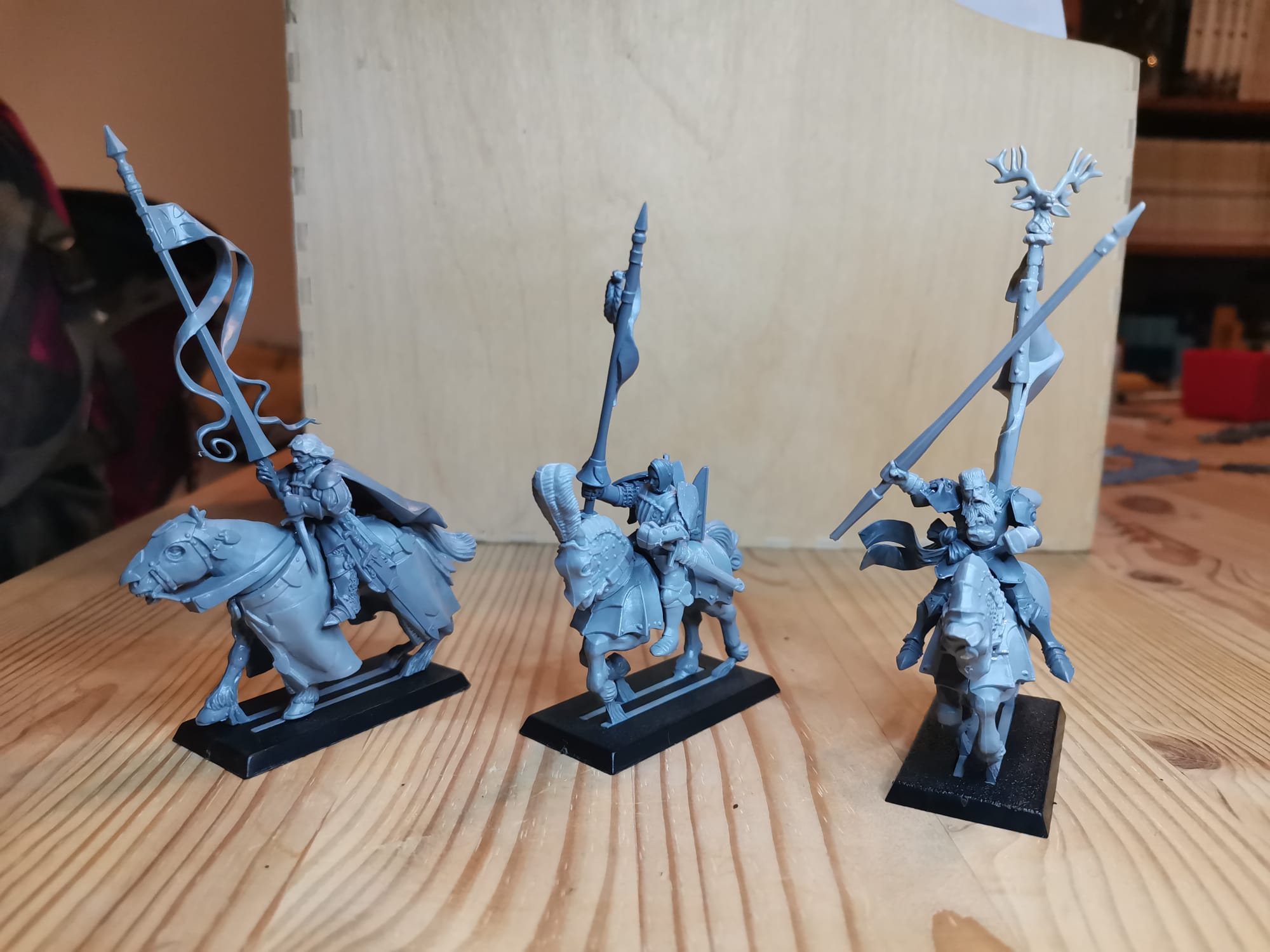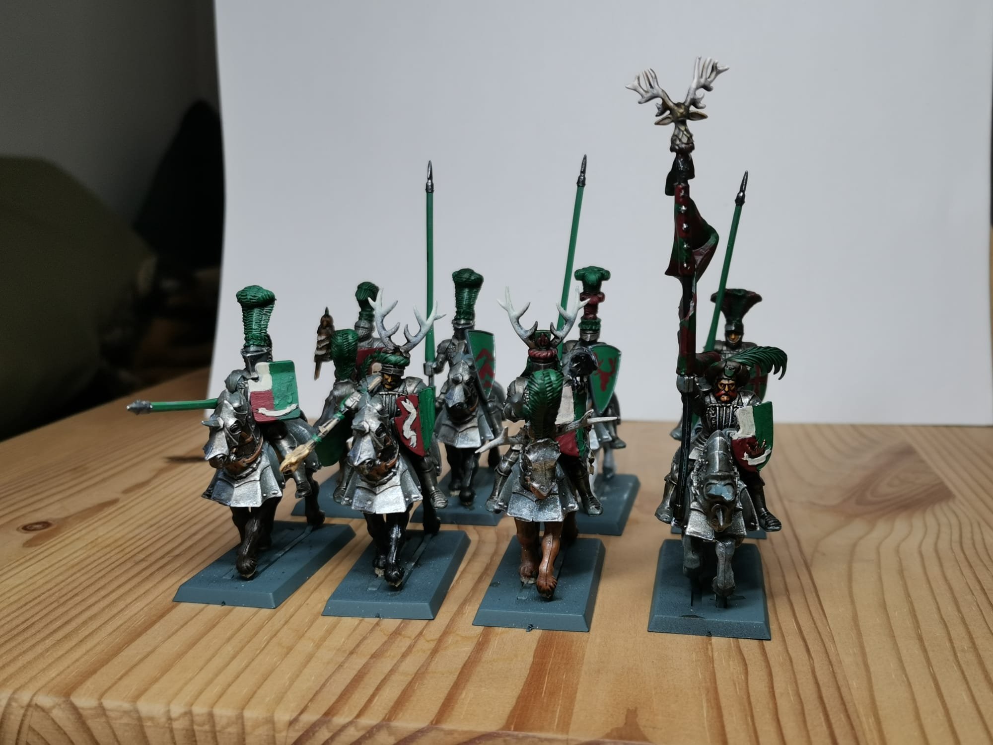 Hier mal ein paar Bilder zu meinen Rittern des Hirschen. Die Bases sind noch nicht gestaltet weil ich zu dem Zeitpunkt schon wusste das andere Basegrößen kommen werden ich aber noch nicht wusste welche Größe das werden wir obwohl ich mir schon dachte das es wohl 30x60 sein wird. Demnächst besorg ich mir passende Bases und dann geht die Basegestaltung los. Gerade bei den Hirschrittern will ich da doch einiges machen. Ich werde auf ihren Bases auch immer wieder Hunde platzieren (das geht dank größerer Bases ganz gut), das soll ein wenig das Jagdthema zeigen.