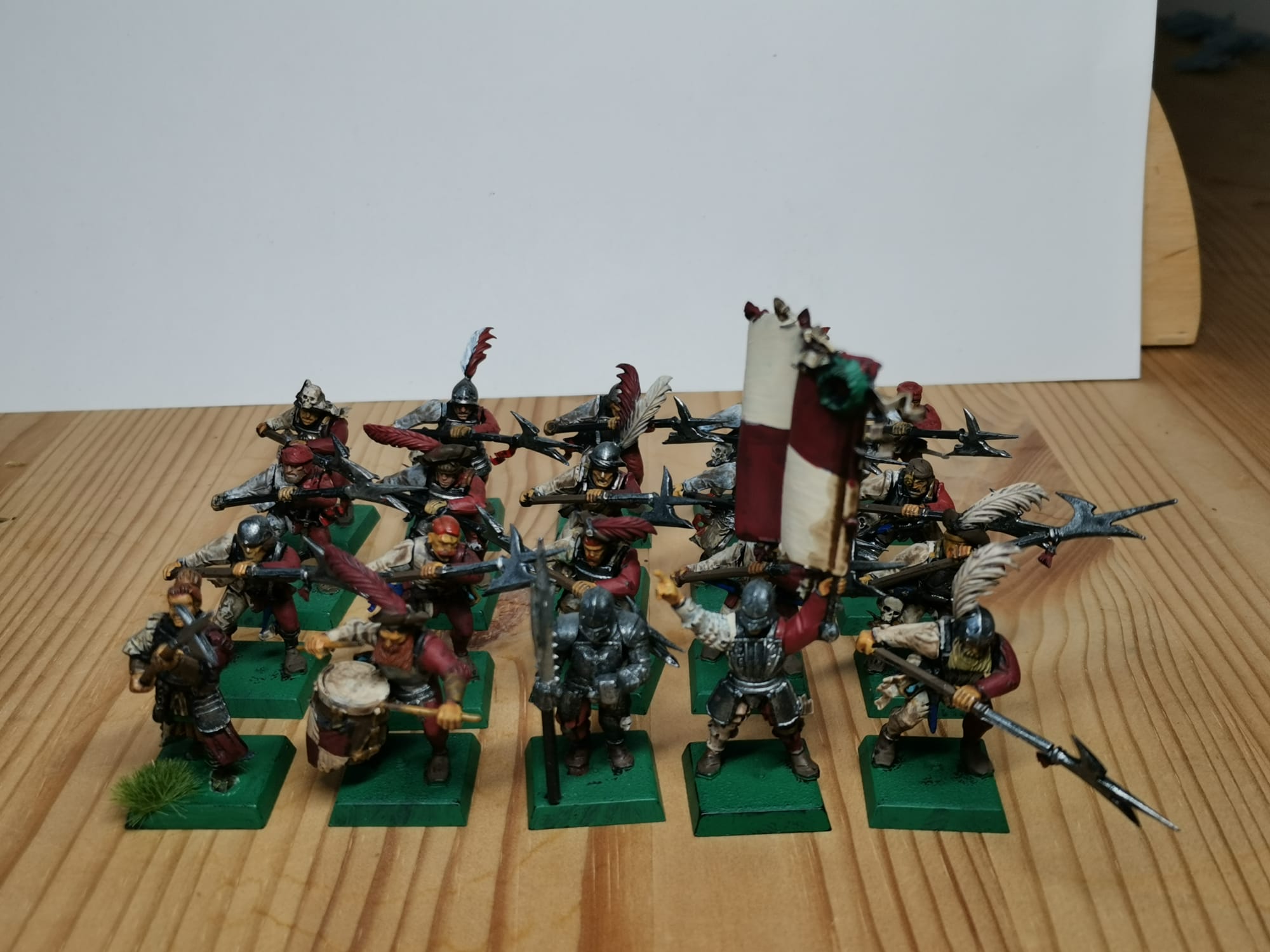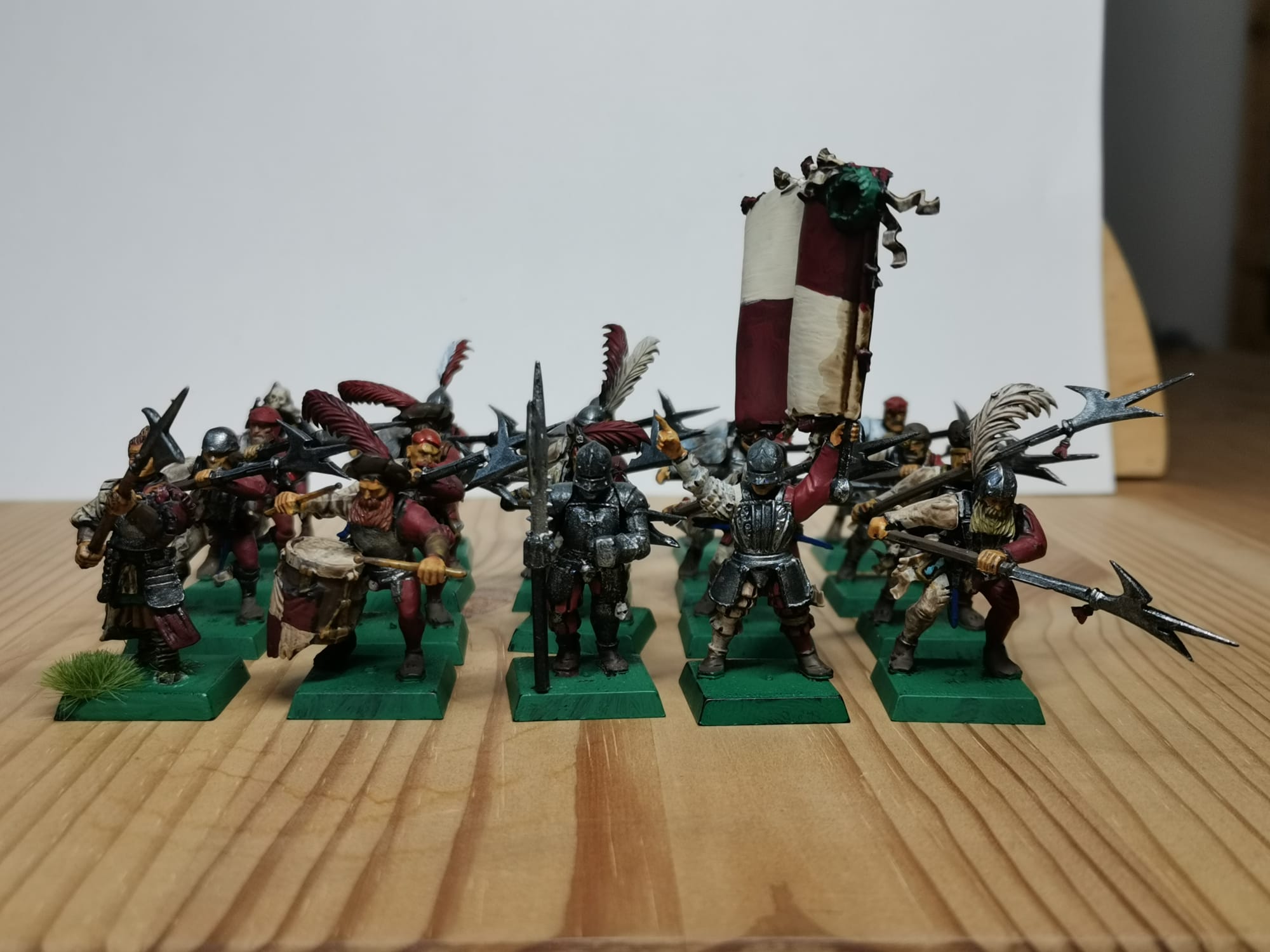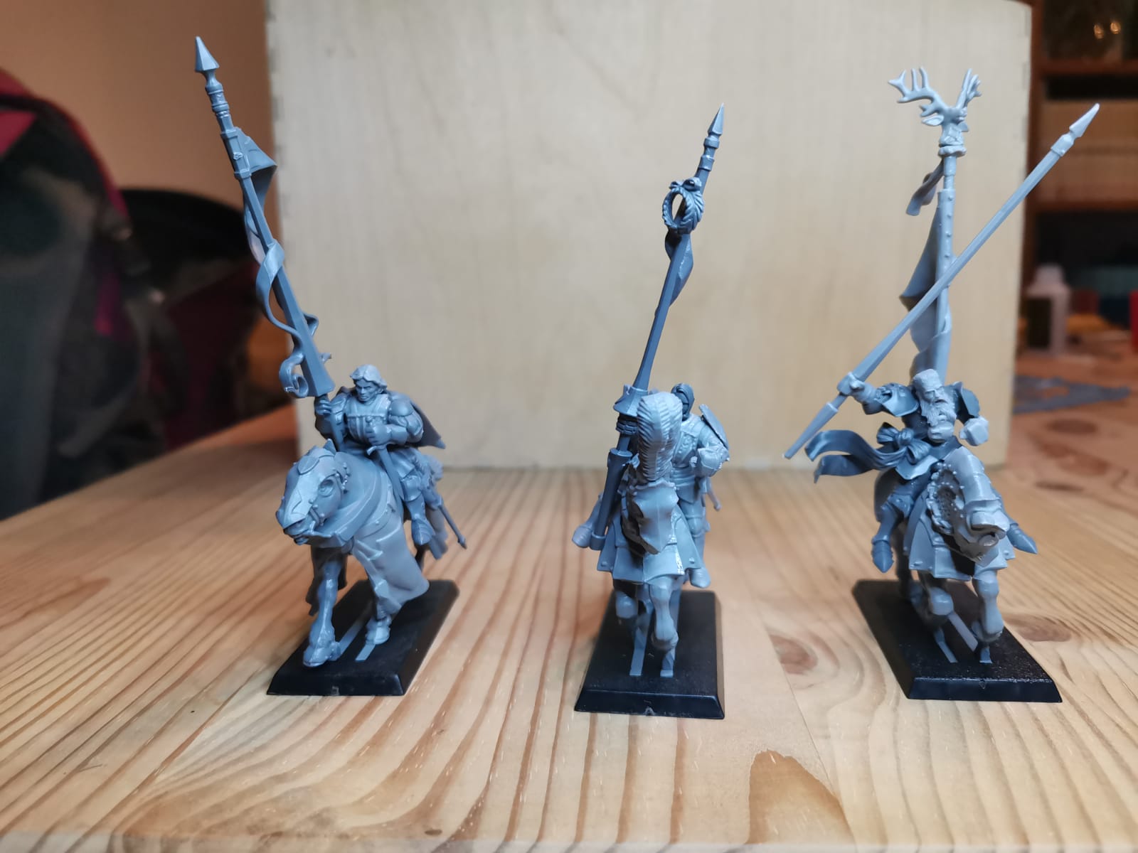 Hier mal ein paar Bilder zu meinen Rittern des Hirschen. Die Bases sind noch nicht gestaltet weil ich zu dem Zeitpunkt schon wusste das andere Basegrößen kommen werden ich aber noch nicht wusste welche Größe das werden wir obwohl ich mir schon dachte das es wohl 30x60 sein wird. Demnächst besorg ich mir passende Bases und dann geht die Basegestaltung los. Gerade bei den Hirschrittern will ich da doch einiges machen. Ich werde auf ihren Bases auch immer wieder Hunde platzieren (das geht dank größerer Bases ganz gut), das soll ein wenig das Jagdthema zeigen.