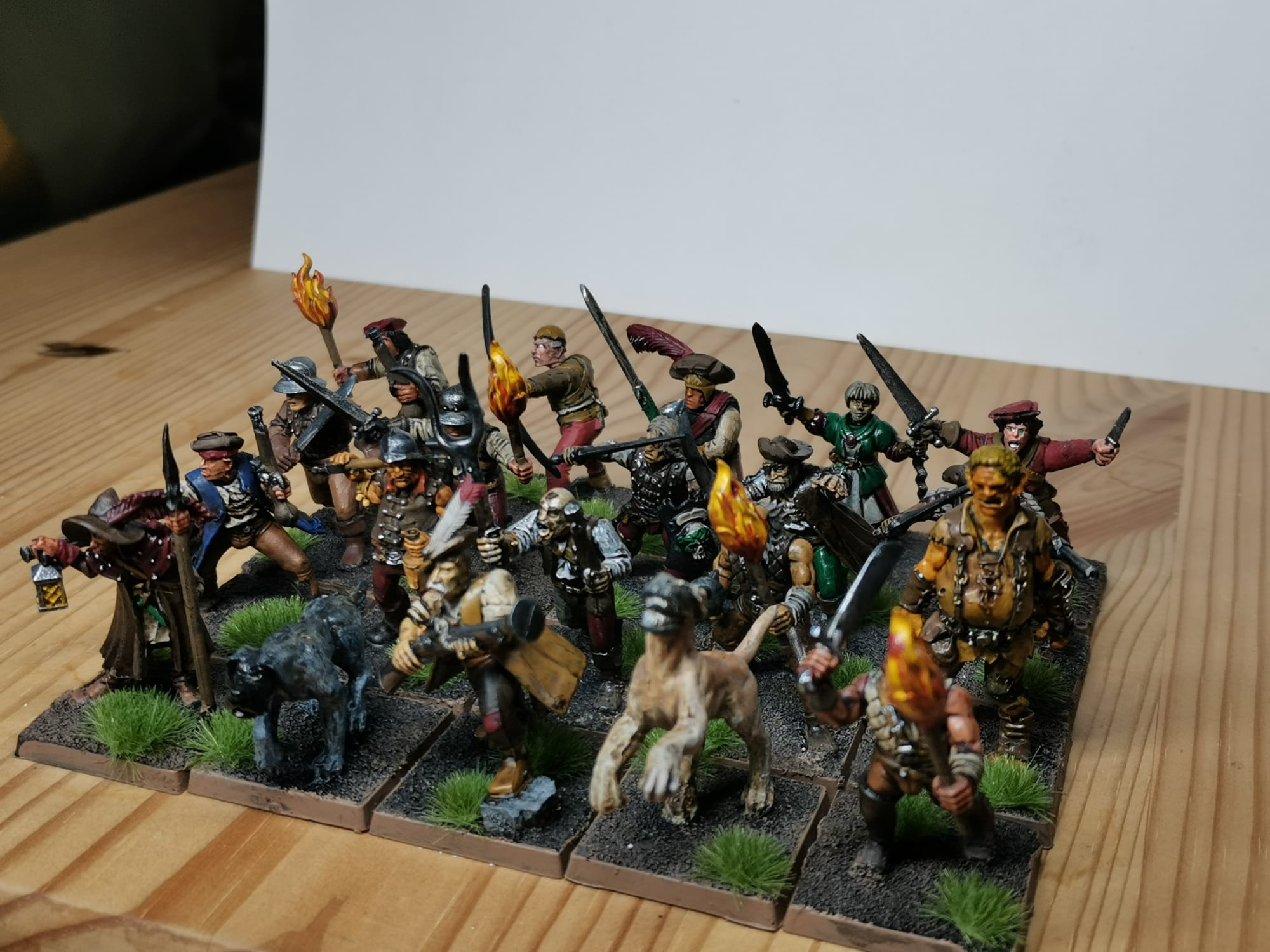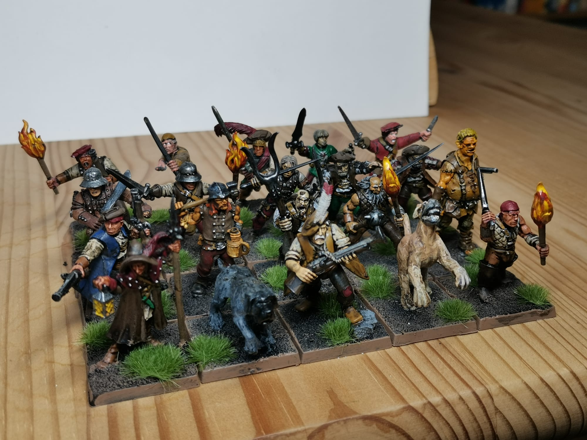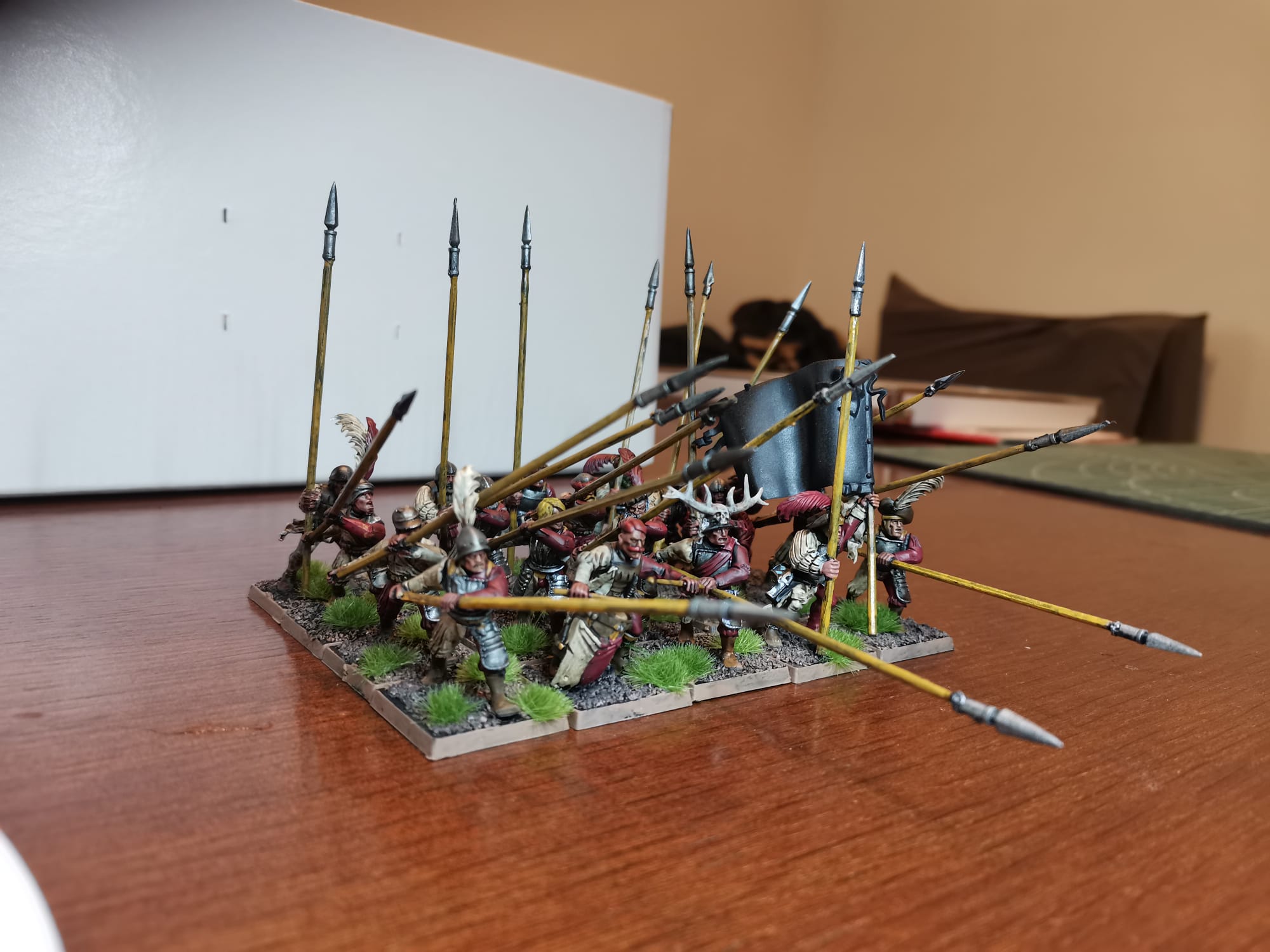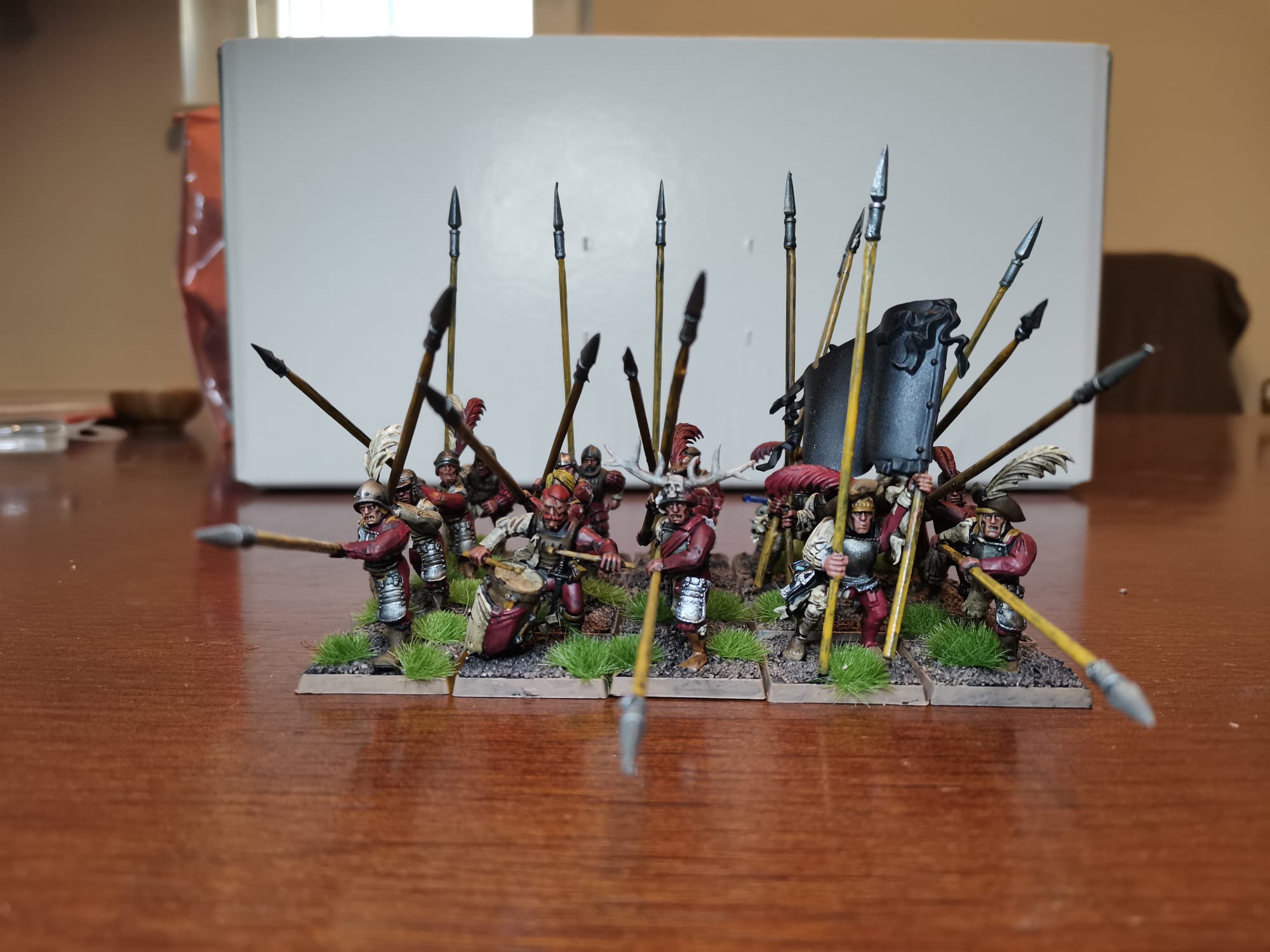 Hier mal ein paar Bilder zu meinen Rittern des Hirschen. Die Bases sind noch nicht gestaltet weil ich zu dem Zeitpunkt schon wusste das andere Basegrößen kommen werden ich aber noch nicht wusste welche Größe das werden wir obwohl ich mir schon dachte das es wohl 30x60 sein wird. Demnächst besorg ich mir passende Bases und dann geht die Basegestaltung los. Gerade bei den Hirschrittern will ich da doch einiges machen. Ich werde auf ihren Bases auch immer wieder Hunde platzieren (das geht dank größerer Bases ganz gut), das soll ein wenig das Jagdthema zeigen.
