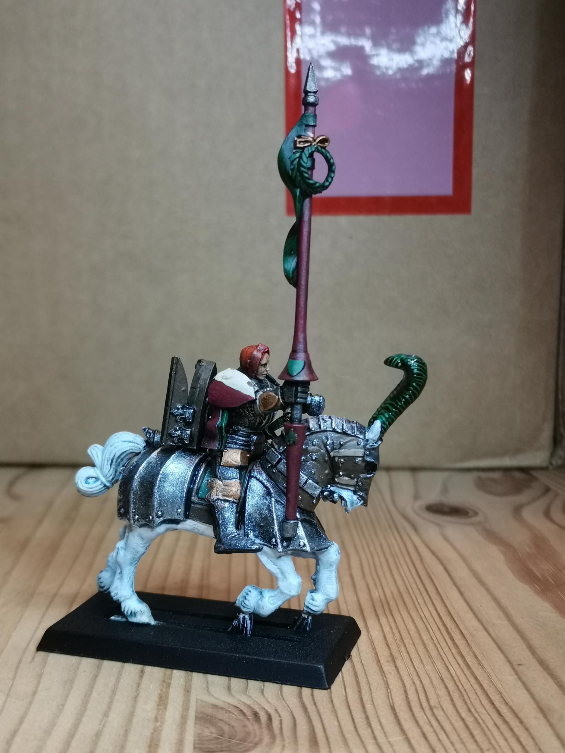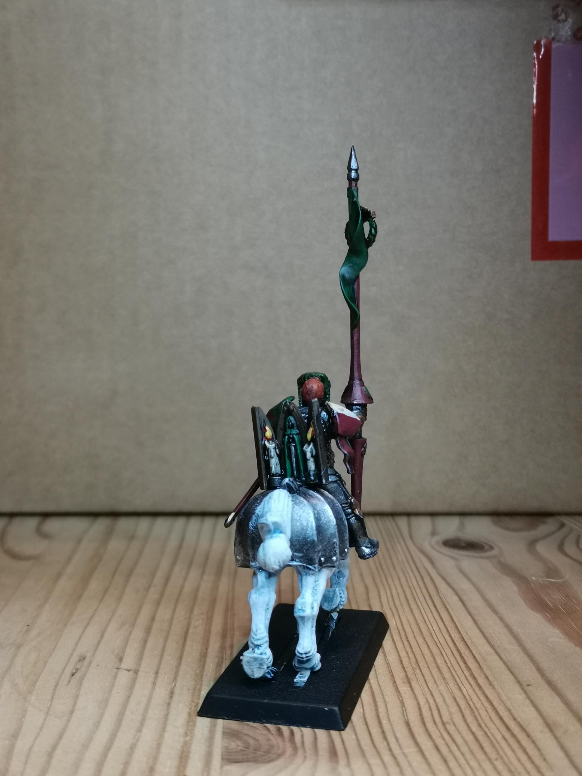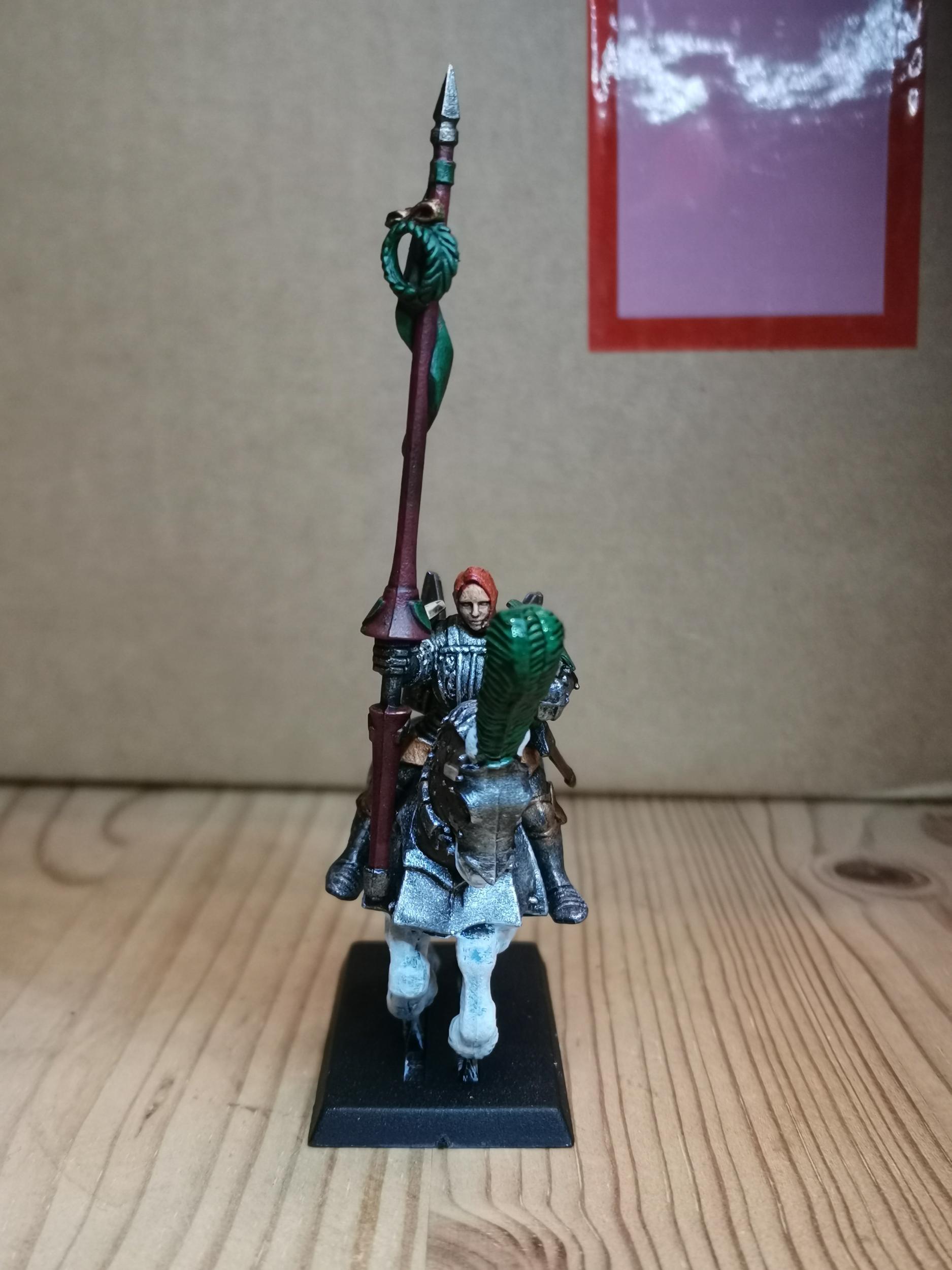 Dann gibt es natürlich noch einen Ordensmeister. Diesen hab ich zusammengebaut aus Teilen des alten Generalgussrahmen, aus dem Gussrahmen von Karl Franz auf Greif und ein paar Teilen von bretonischen Rittern der 5. und 6. Edition.