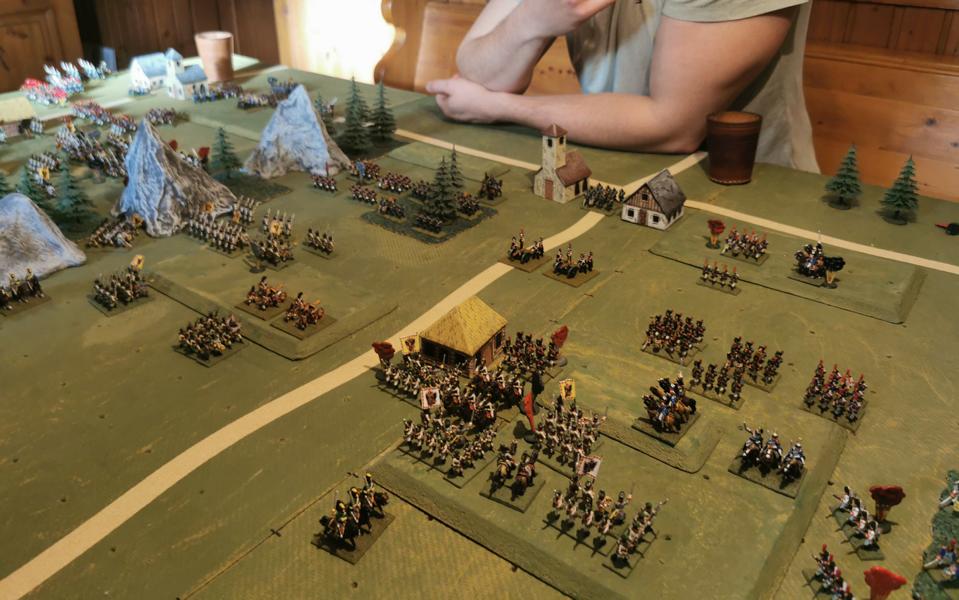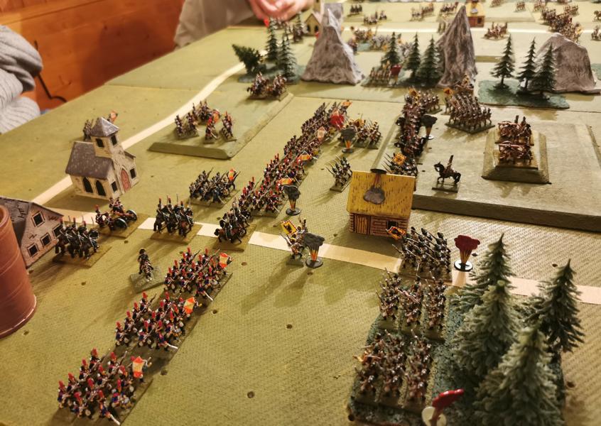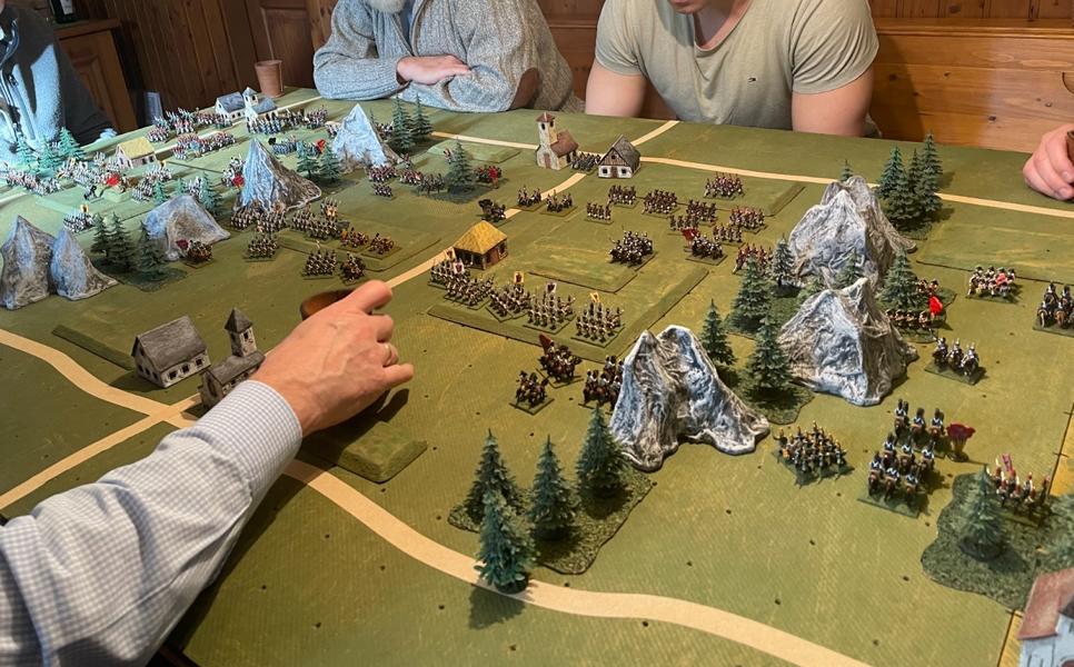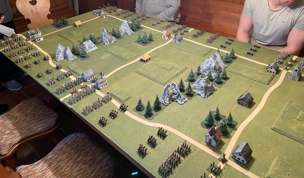 Am Samstag den 16.03.24 haben wir mit 6 Freunden einen fiktiven Übergang durch das Erzgebige nach der gewonnenen Schlacht bei Kulm 1813 in meinem Spielkeller gespielt. Aus spieltaktischen Gründen gab es 3 Gefechtsstreifen (je ein Pass) nach Norden. Auftrag der Alliierten (Österreicher und Russen) war es, den Übergang Richtung Norden (Dresten) wieder zu gewinnen. Auftrag der Franzosen war es dies zu verhindern. Den Franzosen gelang es die Alliierten wieder in den Raum Kulm zurückzuwerfen. Ein spannendes Spiel.